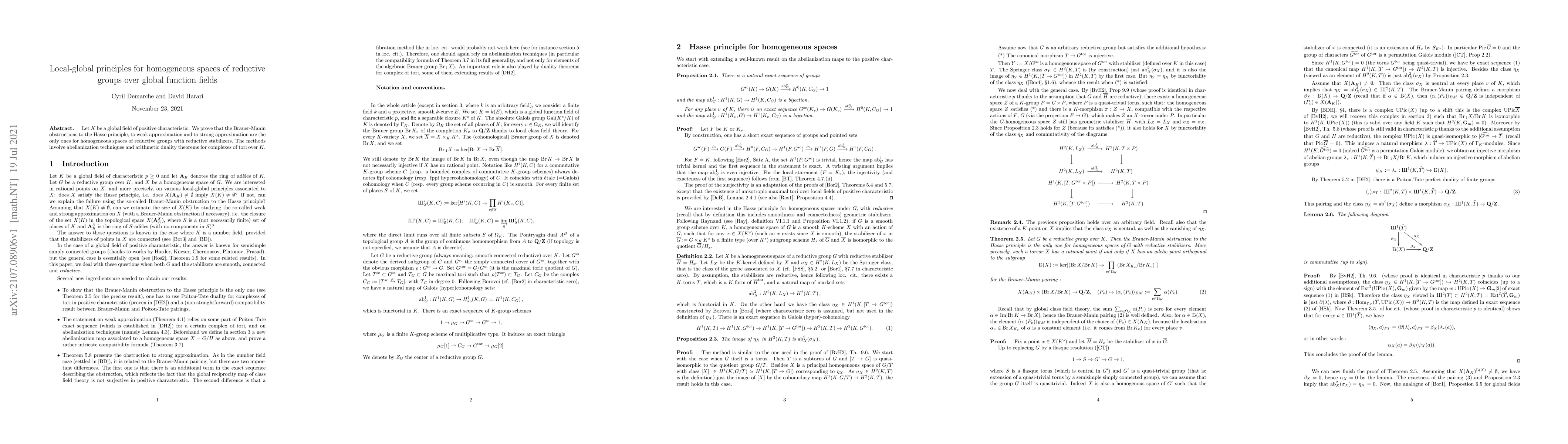 Summary: The paper proves that Brauer-Manin obstructions are the sole local-global principles for homogeneous spaces of reductive groups over global function fields in positive characteristic, using abelianization techniques and arithmetic duality theorems.