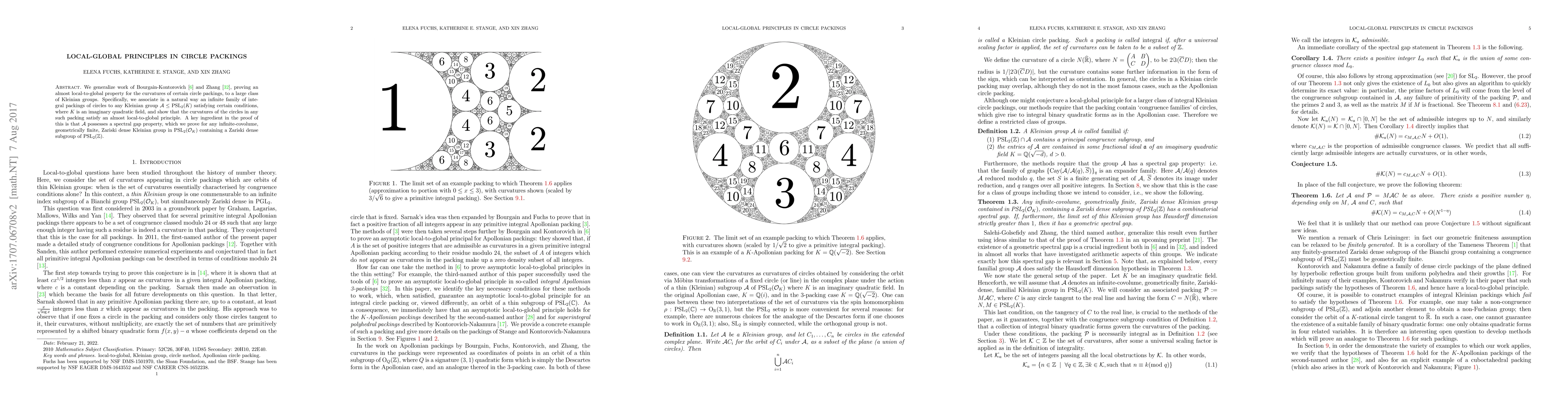 We generalize work of Bourgain-Kontorovich and Zhang, proving an almost local-to-global property for the curvatures of certain circle packings, to a large class of Kleinian groups. Specifically, we associate in a natural way an infinite family of integral packings of circles to any Kleinian group $\mathcal A\leq\textrm{PSL}_2(K)$ satisfying certain conditions, where $K$ is an imaginary quadratic field, and show that the curvatures of the circles in any such packing satisfy an almost local-to-global principle. A key ingredient in the proof of this is that $\mathcal A$ possesses a spectral gap property, which we prove for any infinite-covolume, geometrically finite, Zariski dense Kleinian group in $\textrm{PSL}_2(\mathcal{O}_K)$ containing a Zariski dense subgroup of $\textrm{PSL}_2(\mathbb{Z})$.