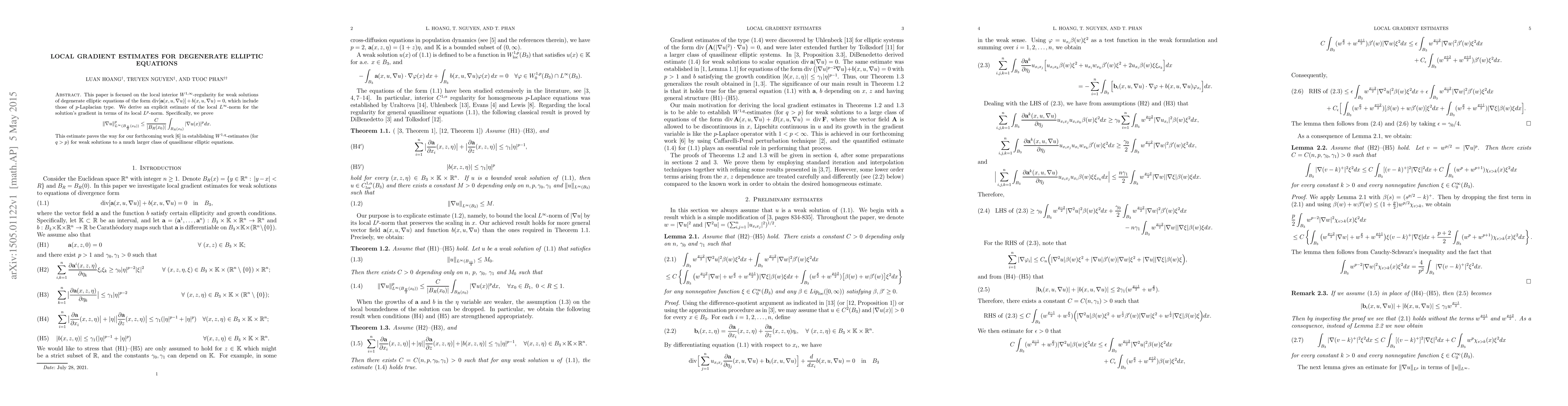 This paper establishes local $W^{1,\infty}$-regularity for weak solutions of degenerate elliptic equations, deriving an explicit $L^\infty$-norm estimate for the gradient in terms of its $L^p$-norm. This paves the way for future work on $W^{1,q}$-estimates for a broader class of quasilinear elliptic equations.