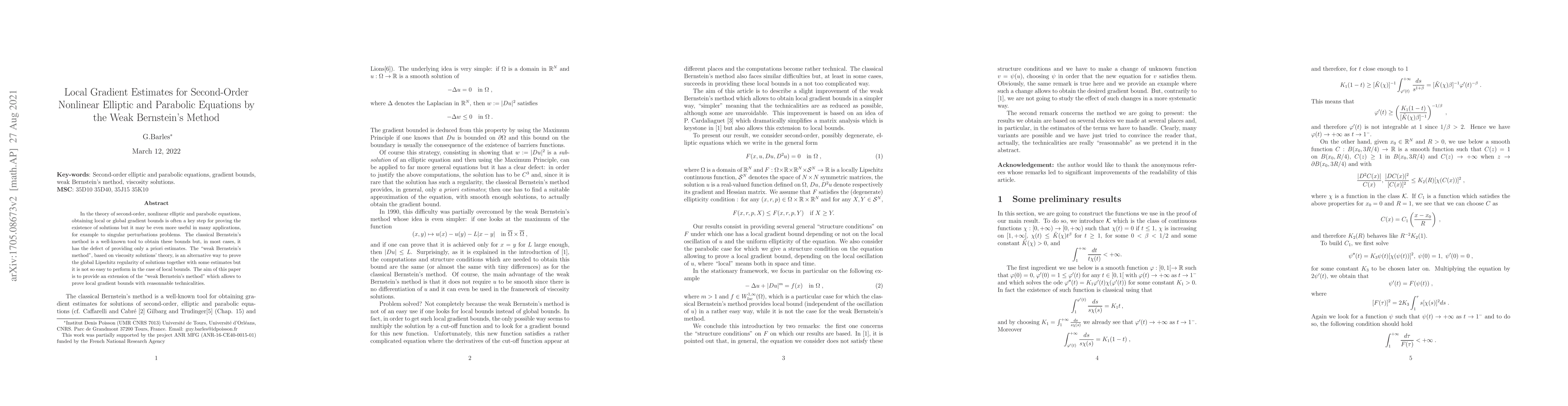 In the theory of second-order, nonlinear elliptic and parabolic equations, obtaining local or global gradient bounds is often a key step for proving the existence of solutions but it may be even more useful in many applications, for example to singular perturbations problems. The classical Bernstein's method is a well-known tool to obtain these bounds but, in most cases, it has the defect of providing only a priori estimates. The "weak Bernstein's method", based on viscosity solutions' theory, is an alternative way to prove the global Lipschitz regularity of solutions together with some estimates but it is not so easy to perform in the case of local bounds. The aim of this paper is to provide an extension of the "weak Bernstein's method" which allows to prove local gradient bounds with reasonnable technicalities.