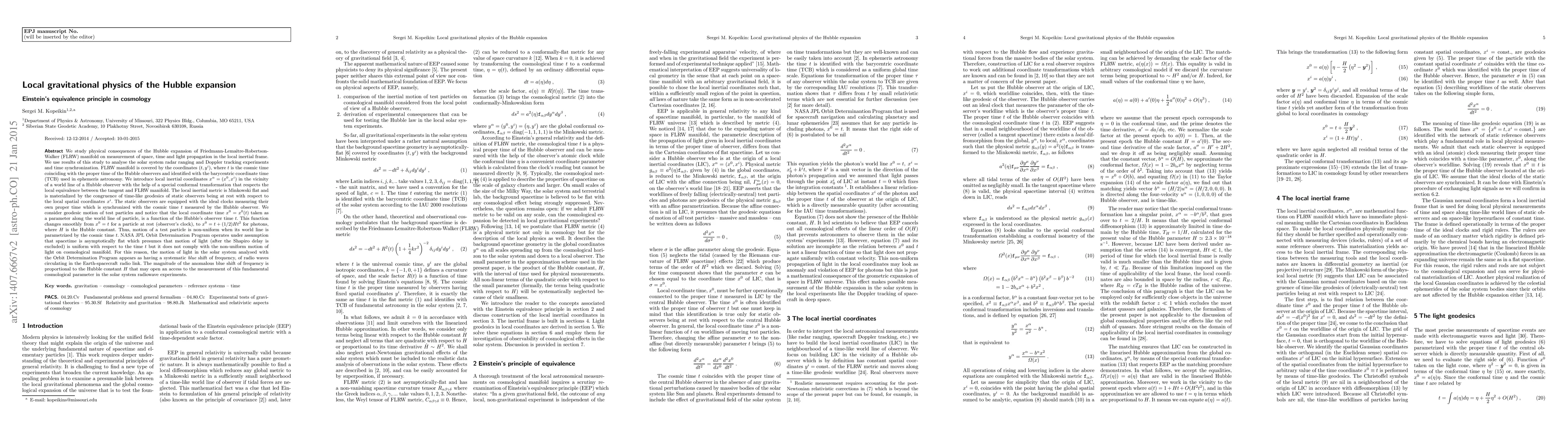 We study physical consequences of the Hubble expansion of FLRW manifold on measurement of space, time and light propagation in the local inertial frame. We analyse the solar system radar ranging and Doppler tracking experiments, and time synchronization. FLRW manifold is covered by global coordinates (t,y^i), where t is the cosmic time coinciding with the proper time of the Hubble observers. We introduce local inertial coordinates x^a=(x^0,x^i) in the vicinity of a world line of a Hubble observer with the help of a special conformal transformation. The local inertial metric is Minkowski flat and is materialized by the congruence of time-like geodesics of static observers being at rest with respect to the local spatial coordinates x^i. We consider geodesic motion of test particles and notice that the local coordinate time x^0=x^0(t) taken as a parameter along the world line of particle, is a function of the Hubble's observer time t. This function changes smoothly from x^0=t for a particle at rest (observer's clock), to x^0=t+1/2 Ht^2 for photons, where H is the Hubble constant. Thus, motion of a test particle is non-uniform when its world line is parametrized by time t. NASA JPL Orbit Determination Program presumes that motion of light (after the Shapiro delay is excluded) is uniform with respect to the time t but it does not comply with the non-uniform motion of light on cosmological manifold. For this reason, the motion of light in the solar system analysed with the Orbit Determination Program appears as having a systematic blue shift of frequency, of radio waves circulating in the Earth-spacecraft radio link. The magnitude of the anomalous blue shift of frequency is proportional to the Hubble constant H that may open an access to the measurement of this fundamental cosmological parameter in the solar system radiowave experiments.