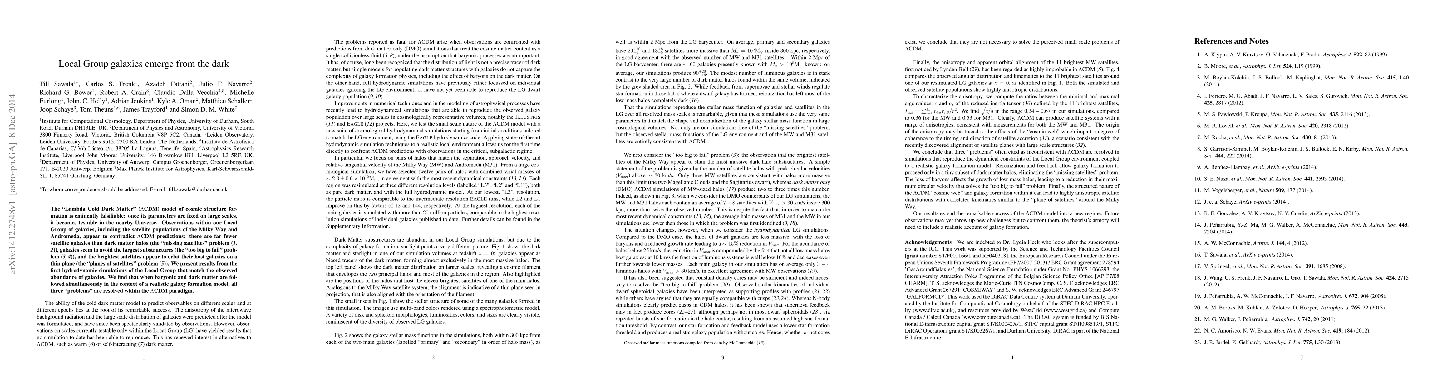 This paper addresses discrepancies in the "Lambda Cold Dark Matter" (LCDM) model within the Local Group, resolving the "missing satellites," "too big to fail," and "planes of satellites" problems through hydrodynamic simulations that incorporate both baryonic and dark matter in a realistic galaxy formation model.