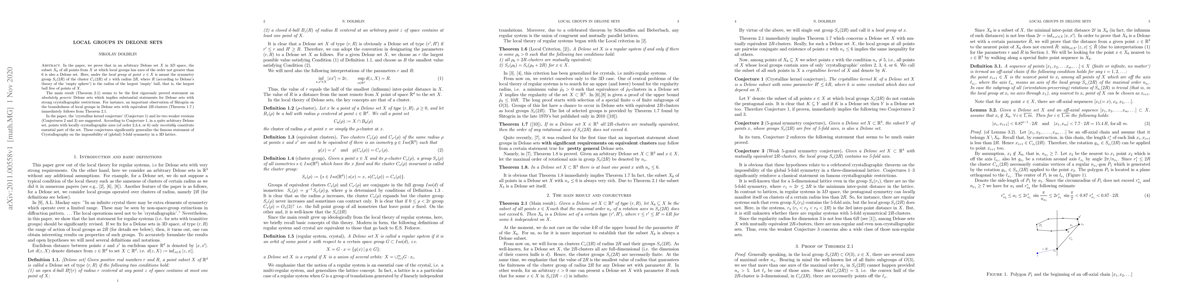 In the paper, we prove that in an arbitrary Delone set $X$ in $3D$ space, the subset $X_6$ of all points from $X$ at which local groups have axes of the order not greater than 6 is also a Delone set. Here, under the local group at point $x\in X$ is meant the symmetry group $S_x(2R)$ of the cluster $C_x(2R)$ of $x$ with radius $2R$, where $R$ (according to Delone's theory of the 'empty sphere') is the radius of the largest 'empty' ball, that is, the largest ball free of points of $X$. The main result seems to be the first rigorously proved statement on absolutely generic Delone sets which implies substantial statements for Delone sets with strong crystallographic restrictions. For instance, an important observation of Shtogrin on the boundedness of local groups in Delone sets with equivalent $2R$-clusters immediately follows from the main theorem. In the paper, the 'crystalline kernel conjecture' (Conjecture 1) and its two weaker versions (Conjectures 2 and 3) are suggested. According to Conjecture 1, in a quite arbitrary Delone set, points with locally crystallographic axes (of order 2,3,4, or 6) only inevitably constitute an essential part of the set. These conjectures significantly generalize the famous statement of Crystallography on the impossibility of (global) 5-fold symmetry in a 3D lattice.
