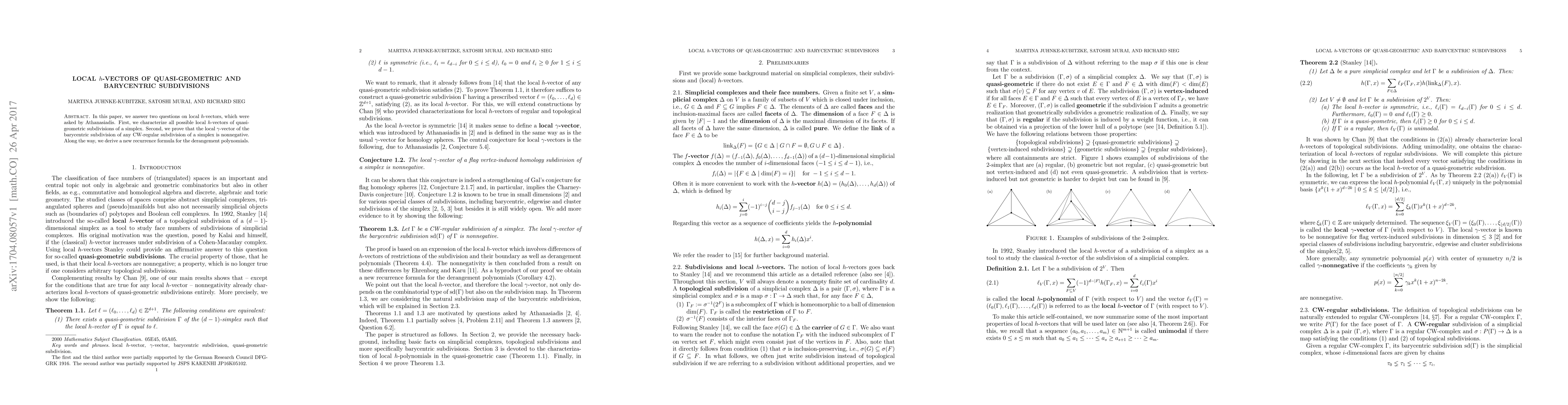 This paper characterizes the local $h$-vectors of quasi-geometric subdivisions of a simplex and proves that the local $\gamma$-vector of the barycentric subdivision of any CW-regular subdivision of a simplex is nonnegative, also deriving a new recurrence formula for derangement polynomials.