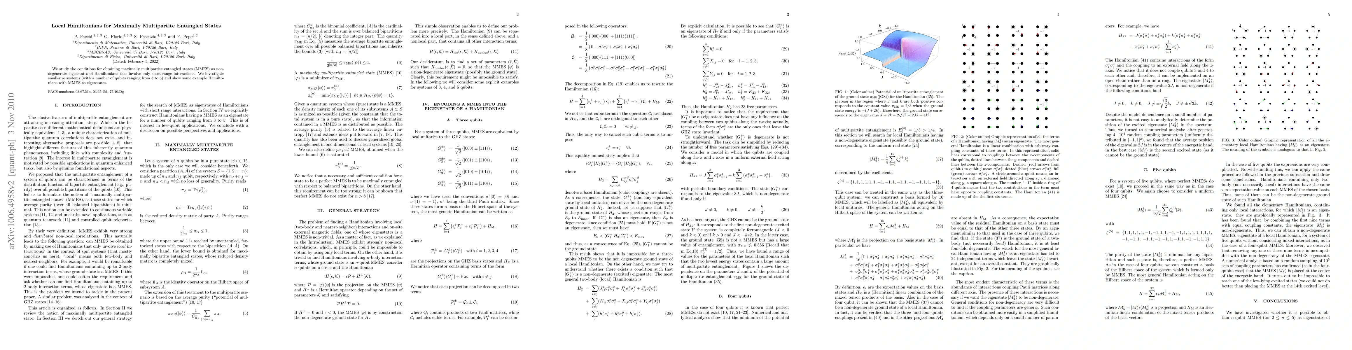 This paper explores the conditions for generating maximally multipartite entangled states (MMES) through non-degenerate eigenstates of local Hamiltonians with short-range interactions. It provides example Hamiltonians for small-size systems (3 to 5 qubits) that yield MMES as their eigenstates.
