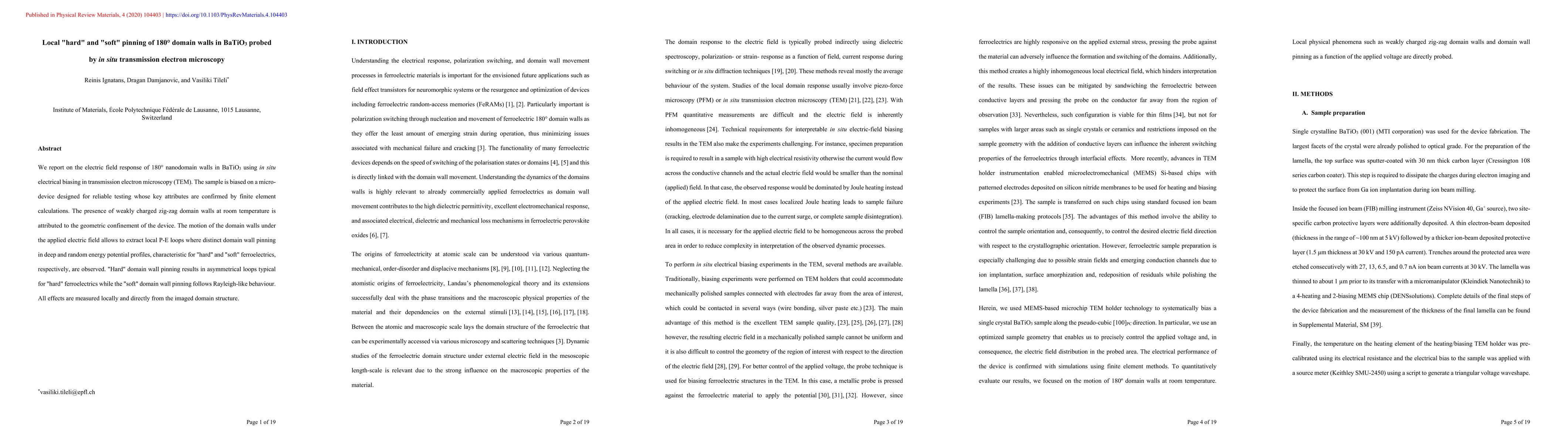This paper investigates the electric field response of 180° nanodomain walls in BaTiO$_3$ using in situ TEM, revealing distinct hard and soft pinning behaviors through local P-E loops. The study attributes the presence of zig-zag domain walls to geometric confinement and observes asymmetrical loops for hard pinning and Rayleigh-like behavior for soft pinning.