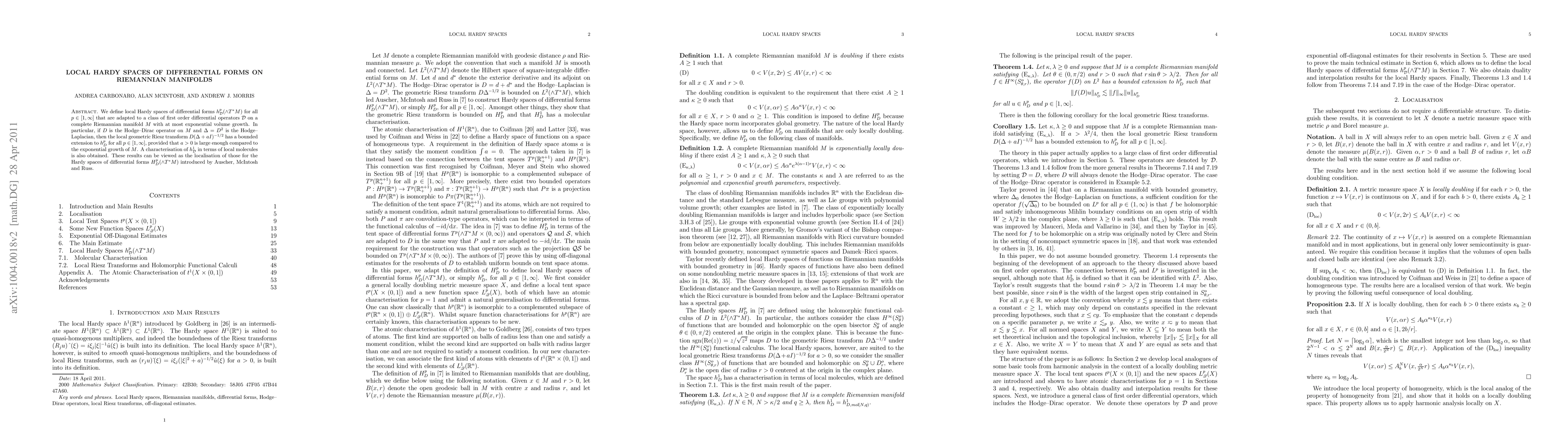 Researchers developed a new framework for local Hardy spaces of differential forms on Riemannian manifolds, enabling the extension of certain operators to these spaces under specific growth conditions.