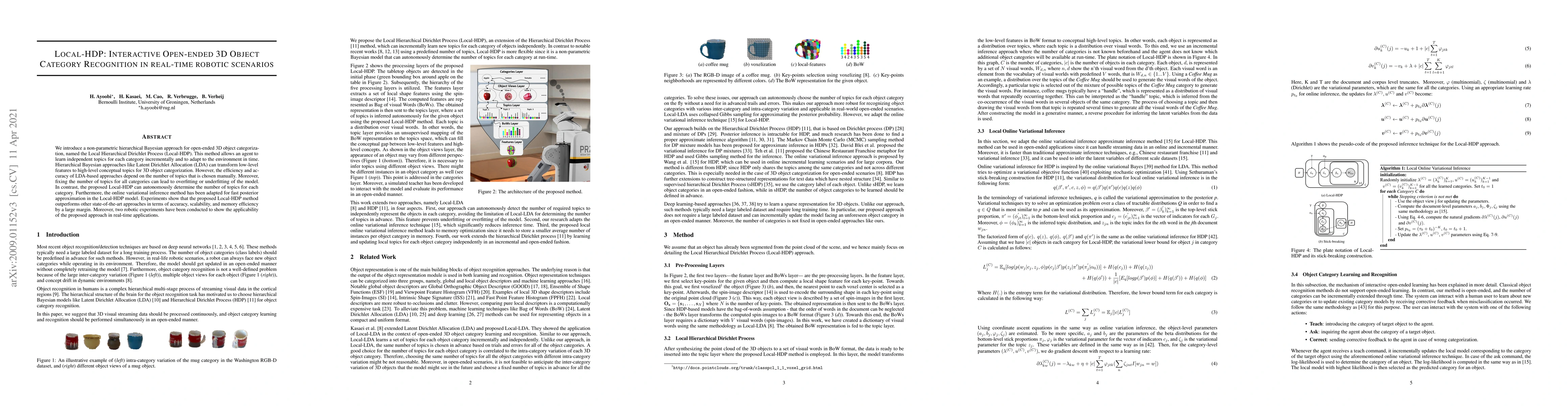 The paper introduces Local-HDP, a non-parametric hierarchical Bayesian method for open-ended 3D object categorization that autonomously determines the number of topics per category, outperforming existing LDA-based approaches in accuracy and efficiency. Real-time robotic experiments demonstrate its practical applicability.