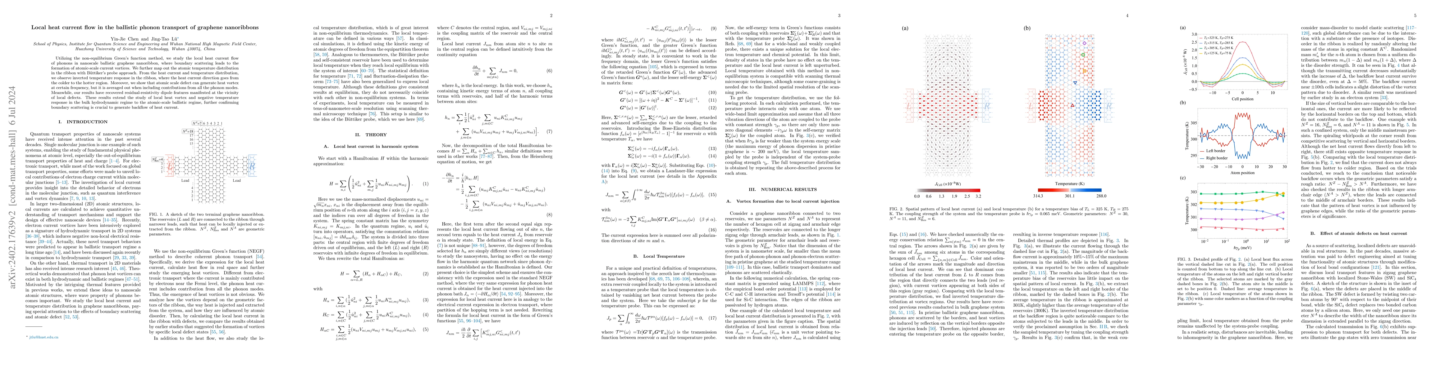 Utilizing nonequilibrium Green's function method, we study the phonon local heat current flow in nanoscale graphene nanoribbons. Ballistic transport and boundary scattering lead to formation of atomic scale current vortices. Using the B\"uttiker probe approach, we further map out the temperature distribution in the junction. From the heat current and temperature distribution, we observe negative local resistance of the junctions, where heat current direction goes from colder to hotter regime. Moreover, we show that atomic scale defect can generate heat vortex at certain frequency, but it is averaged out when including contributions from all the phonon modes. These results extend the study of local heat vortex and negative temperature response in bulk hydrodynamic regime to atomic-scale ballistic regime, further confirming boundary scattering is crucial to generate backflow of heat current.