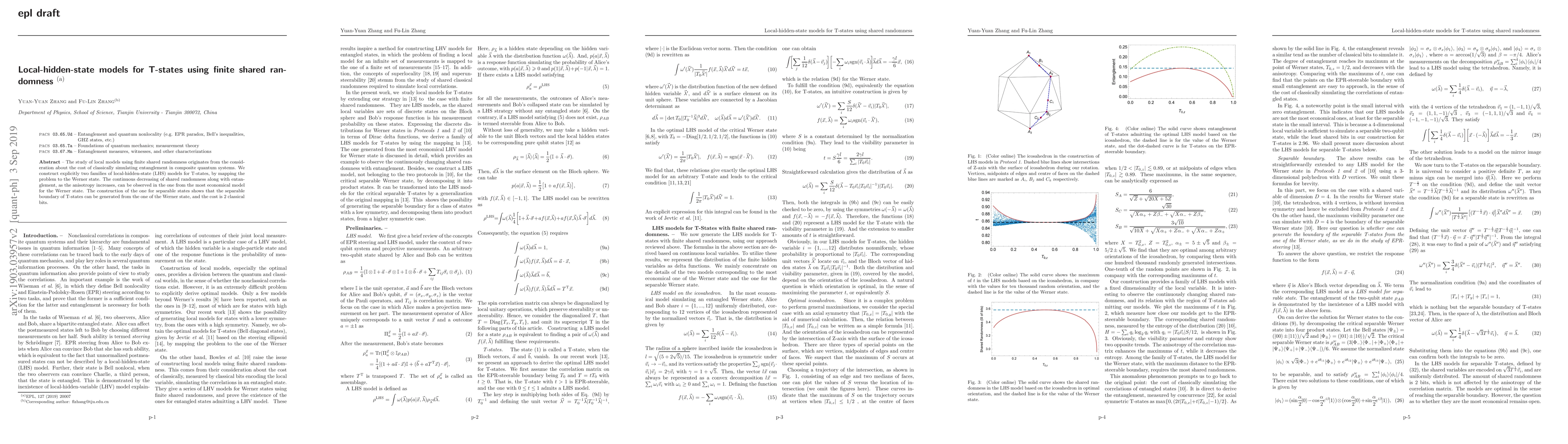 This paper constructs local-hidden-state models for T-states using finite shared randomness, focusing on the cost of simulating entanglement. It demonstrates two families of LHS models for T-states, revealing a continuous decrease in shared randomness with increasing anisotropy, and showing that the separable boundary of T-states can be generated from the Werner state with a cost of 2 classical bits.
