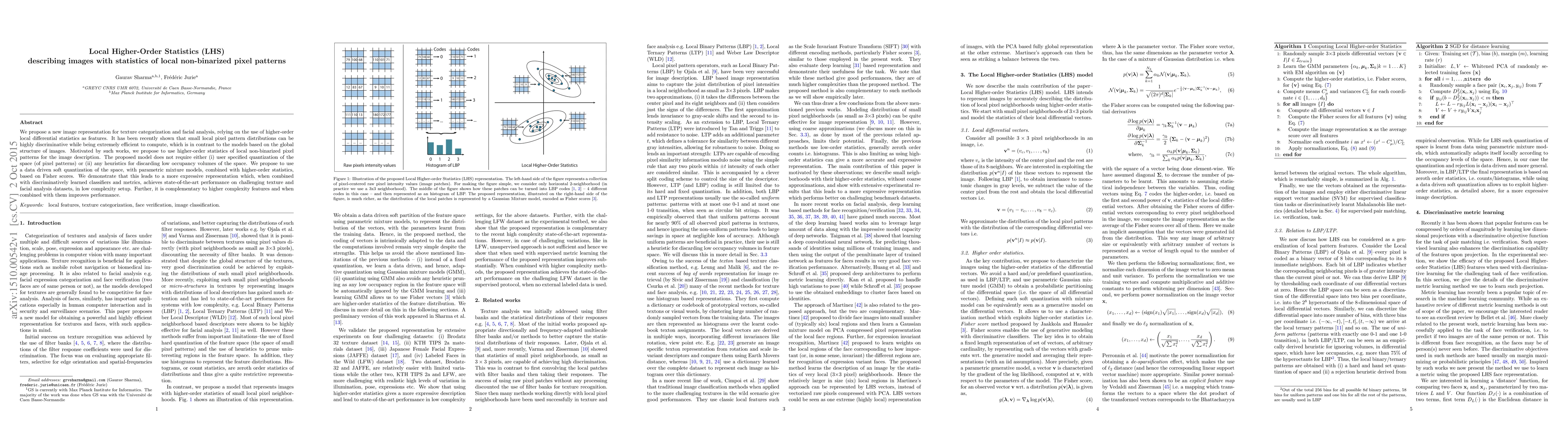 We propose a new image representation for texture categorization and facial analysis, relying on the use of higher-order local differential statistics as features. It has been recently shown that small local pixel pattern distributions can be highly discriminative while being extremely efficient to compute, which is in contrast to the models based on the global structure of images. Motivated by such works, we propose to use higher-order statistics of local non-binarized pixel patterns for the image description. The proposed model does not require either (i) user specified quantization of the space (of pixel patterns) or (ii) any heuristics for discarding low occupancy volumes of the space. We propose to use a data driven soft quantization of the space, with parametric mixture models, combined with higher-order statistics, based on Fisher scores. We demonstrate that this leads to a more expressive representation which, when combined with discriminatively learned classifiers and metrics, achieves state-of-the-art performance on challenging texture and facial analysis datasets, in low complexity setup. Further, it is complementary to higher complexity features and when combined with them improves performance.