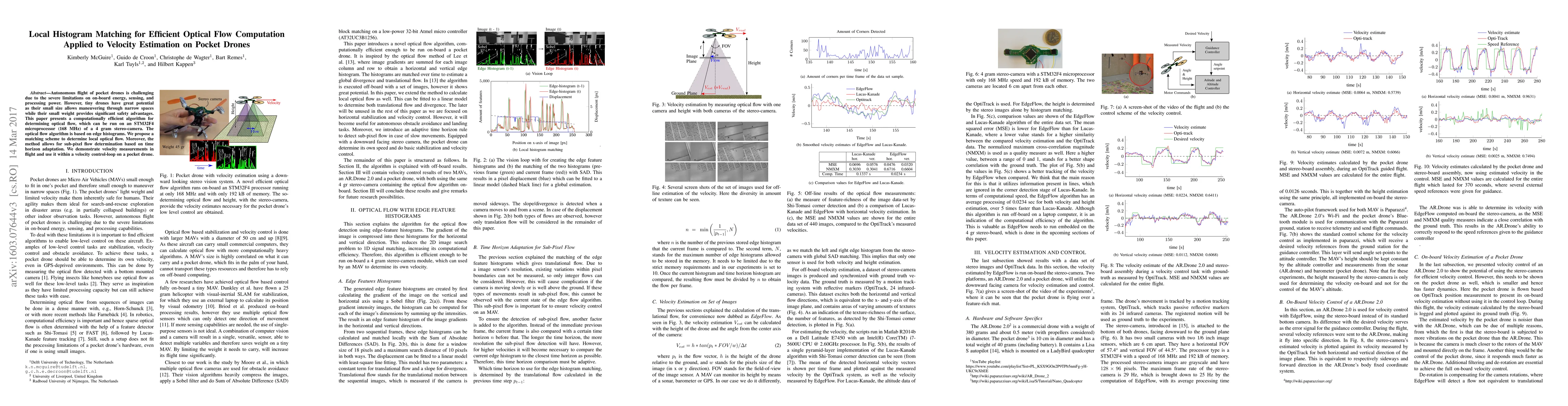 This paper presents an efficient optical flow algorithm based on local histogram matching for on-board computation on a 4 gram stereo-camera equipped STM32F4 microprocessor. The method enables sub-pixel flow determination and is demonstrated for real-time velocity estimation and control in pocket drones.