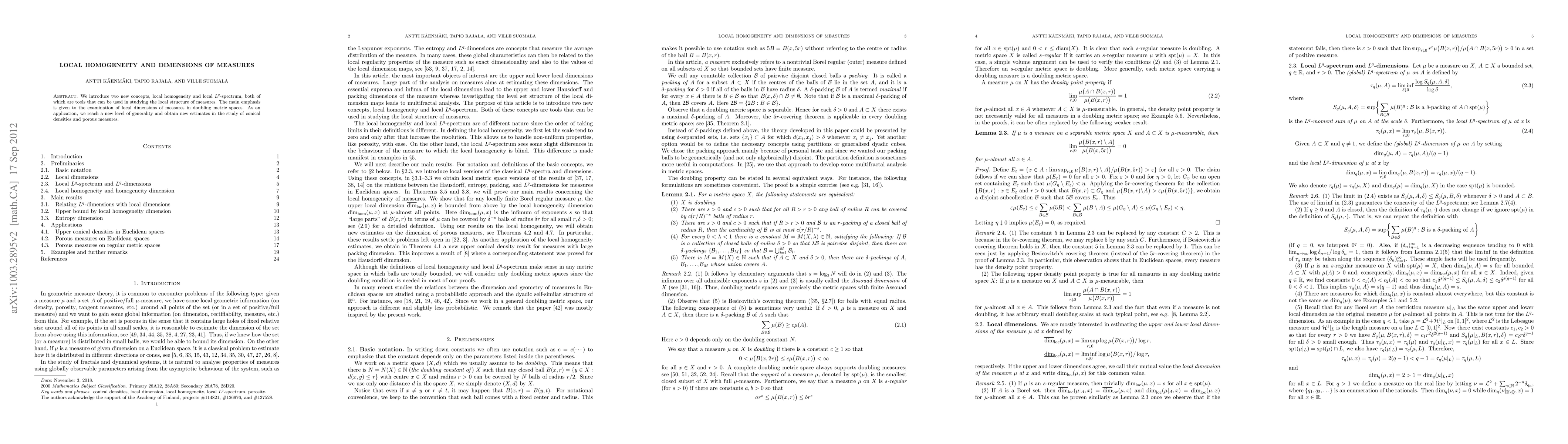 We introduce two new concepts, local homogeneity and local L^q-spectrum, both of which are tools that can be used in studying the local structure of measures. The main emphasis is given to the examination of local dimensions of measures in doubling metric spaces. As an application, we reach a new level of generality and obtain new estimates in the study of conical densities and porous measures.