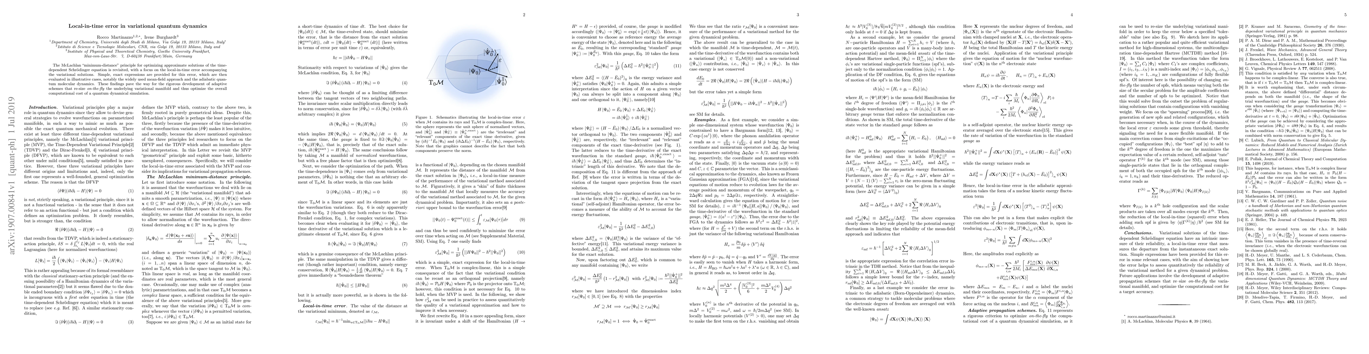 The McLachlan "minimum-distance" principle for optimizing approximate solutions of the time-dependent Schrodinger equation is revisited, with a focus on the local-in-time error accompanying the variational solutions. Simple, exact expressions are provided for this error, which are then evaluated in illustrative cases, notably the widely used mean-field approach and the adiabatic quantum molecular dynamics. These findings pave the way for the rigorous development of adaptive schemes that re-size on-the-fly the underlying variational manifold and thus optimize the overall computational cost of a quantum dynamical simulation.