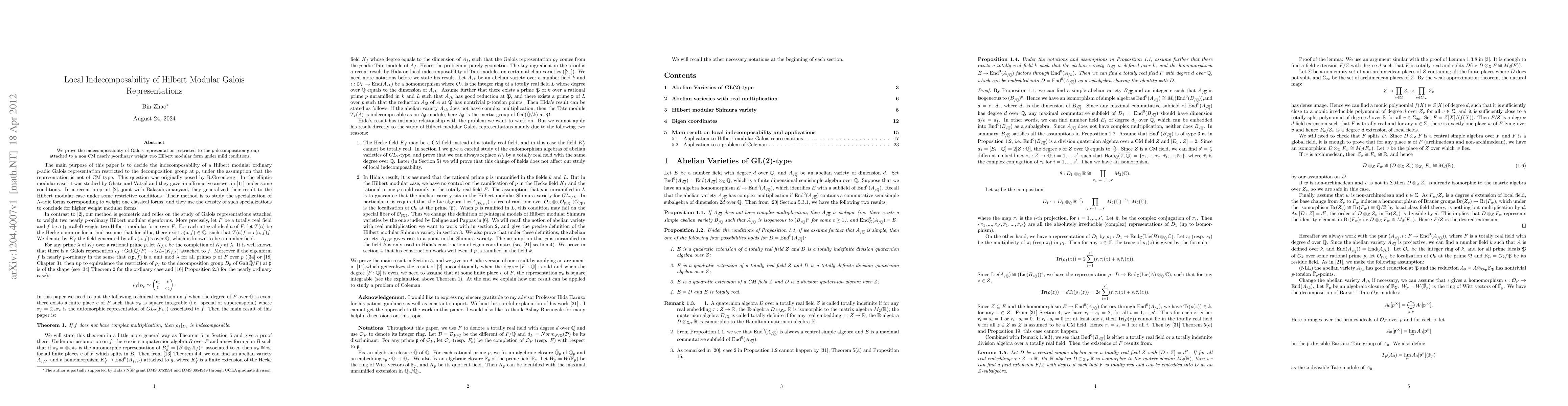 We prove the indecomposability of Galois representation restricted to the p-decomposition group attached to a non CM nearly p-ordinary weight two Hilbert modular form under mild conditions.