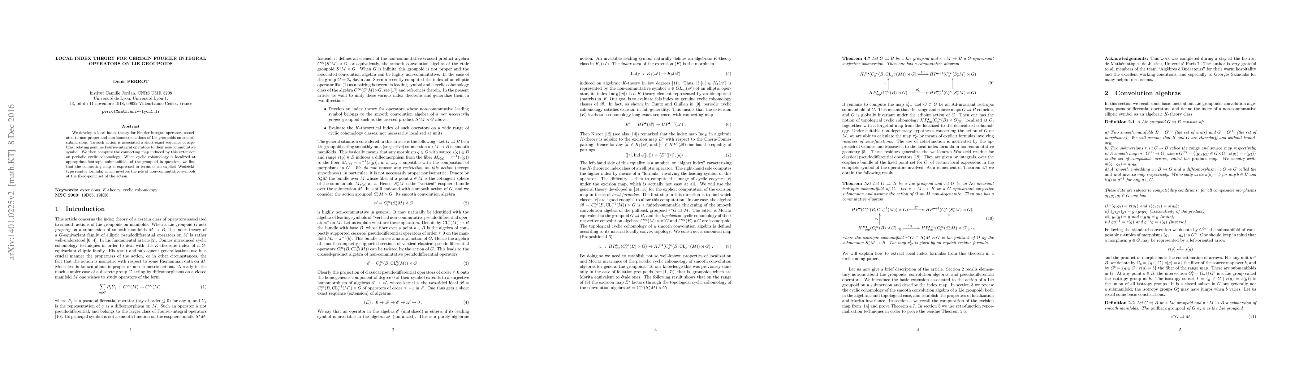 This paper develops a local index theory for Fourier-integral operators tied to non-proper Lie groupoid actions, establishing a short exact sequence linking genuine operators to their non-commutative symbols. The connecting map in periodic cyclic cohomology is computed and localized at isotropic submanifolds, yielding a Wodzicki-type residue formula involving non-commutative symbol jets at the fixed-point set.