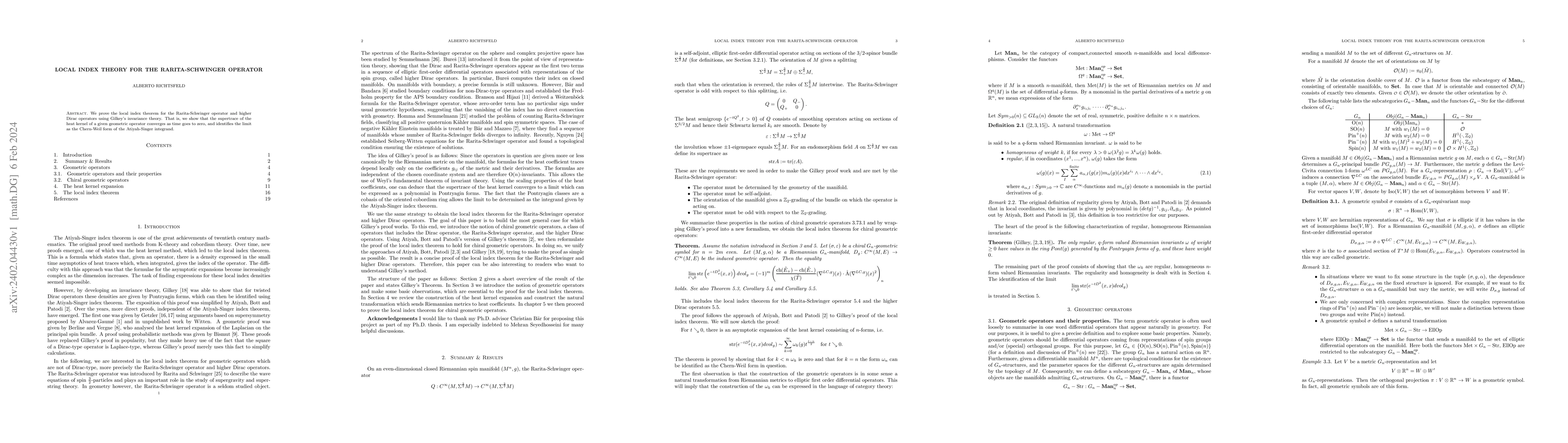 This paper proves the local index theorem for the Rarita-Schwinger and higher Dirac operators using Gilkey's invariance theory, demonstrating that the supertrace of their heat kernels converges to the Chern-Weil form of the Atiyah-Singer integrand.