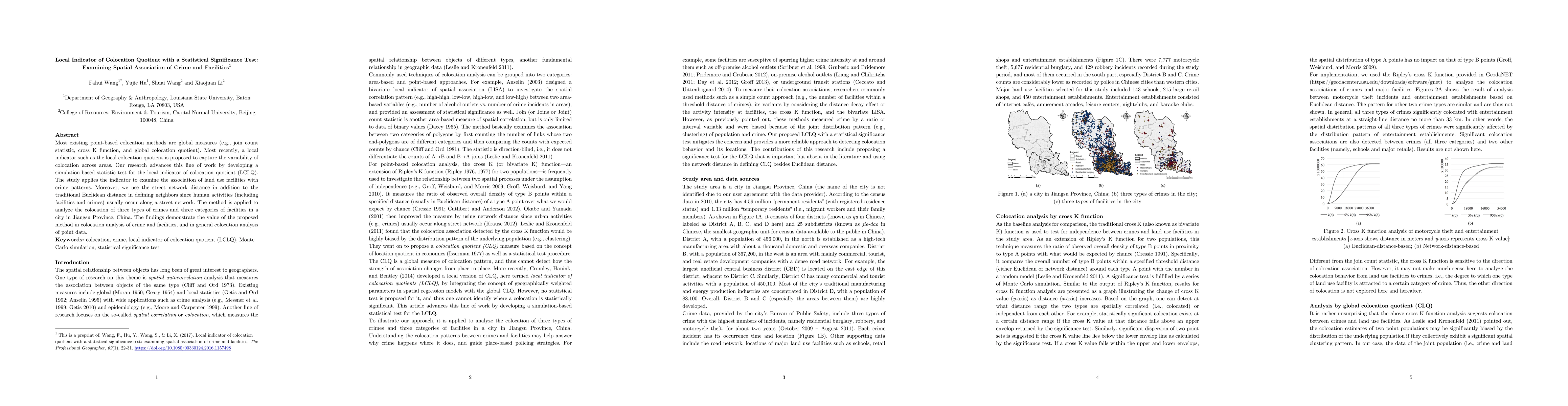 Most existing point-based colocation methods are global measures (e.g., join count statistic, cross K function, and global colocation quotient). Most recently, a local indicator such as the local colocation quotient is proposed to capture the variability of colocation across areas. Our research advances this line of work by developing a simulation-based statistic test for the local indicator of colocation quotient (LCLQ). The study applies the indicator to examine the association of land use facilities with crime patterns. Moreover, we use the street network distance in addition to the traditional Euclidean distance in defining neighbors since human activities (including facilities and crimes) usually occur along a street network. The method is applied to analyze the colocation of three types of crimes and three categories of facilities in a city in Jiangsu Province, China. The findings demonstrate the value of the proposed method in colocation analysis of crime and facilities, and in general colocation analysis of point data.