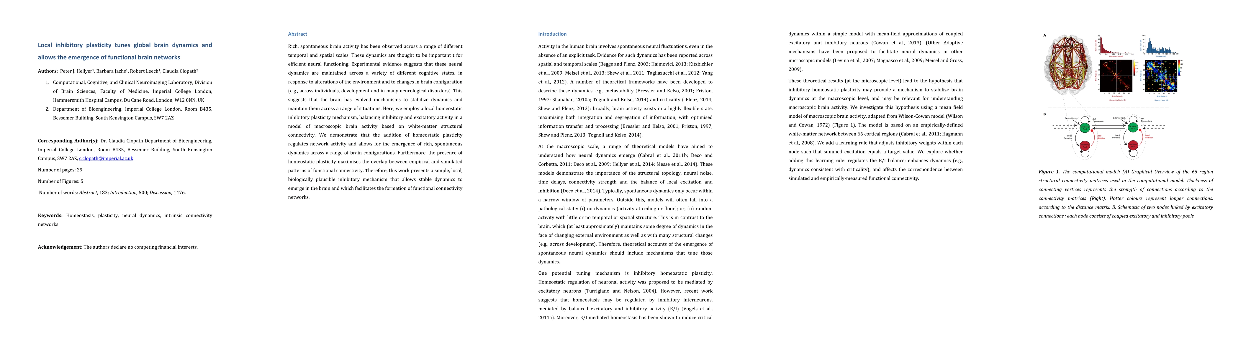 This paper demonstrates that local inhibitory plasticity mechanisms can regulate brain activity and enable the emergence of rich, spontaneous dynamics across various brain configurations. The study shows that such plasticity facilitates the formation of functional connectivity networks, suggesting a biologically plausible method for maintaining stable neural dynamics.