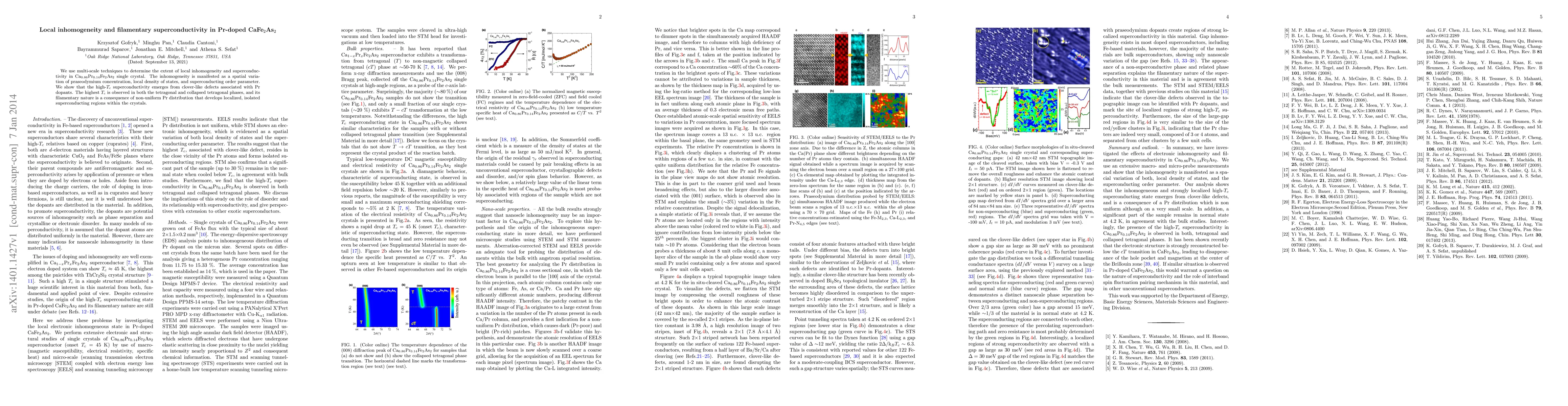 We use multi-scale techniques to determine the extent of local inhomogeneity and superconductivity in Ca$_{0.86}$Pr$_{0.14}$Fe$_{2}$As$_{2}$ single crystal. The inhomogeneity is manifested as a spatial variation of praseodymium concentration, local density of states, and superconducting order parameter. We show that the high-$T_{c}$ superconductivity emerges from clover-like defects associated with Pr dopants. The highest $T_{c}$ is observed in both the tetragonal and collapsed tetragonal phases, and its filamentary nature is a consequence of non-uniform Pr distribution that develops localized, isolated superconducting regions within the crystals.