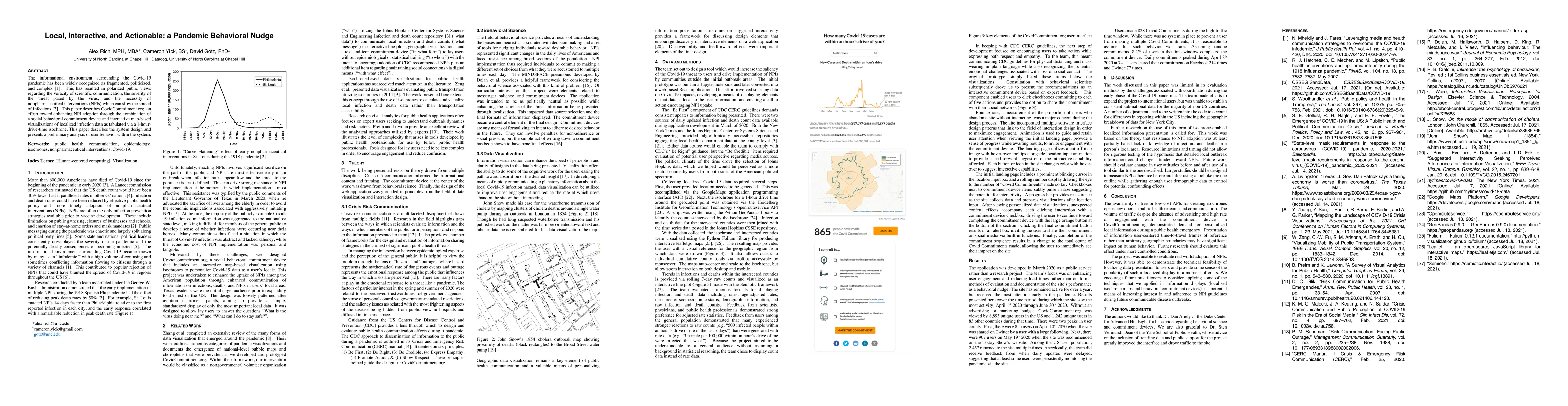 The informational environment surrounding the Covid-19 pandemic has been widely recognized as fragmented, politicized, and complex [1]. This has resulted in polarized public views regarding the veracity of scientific communication, the severity of the threat posed by the virus, and the necessity of nonpharmaceutical interventions (NPIs) which can slow the spread of infections [2]. This paper describes CovidCommitment.org, an effort toward enhancing NPI adoption through the combination of a social behavioral commitment device and interactive map-based visualizations of localized infection data as tabulated via a 1-hourdrive-time isochrone. This paper describes the system design and presents a preliminary analysis of user behavior within the system.