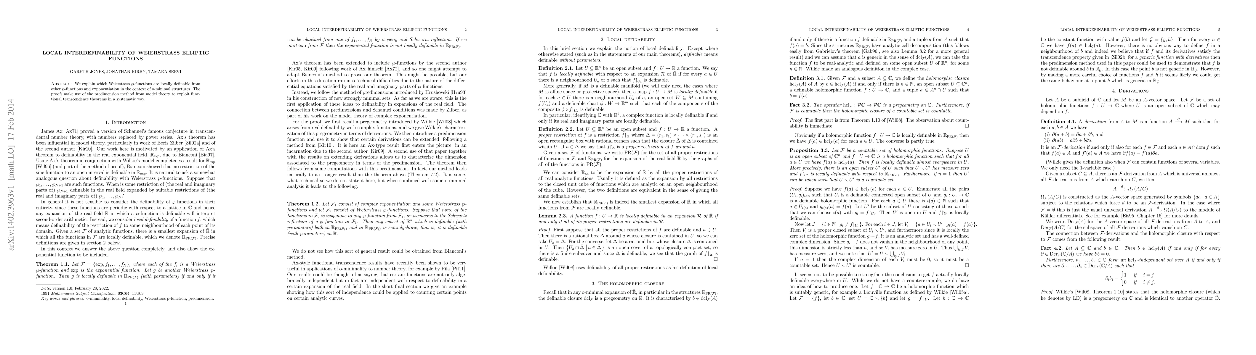 This paper investigates the local interdefinability of Weierstrass elliptic functions within o-minimal structures, utilizing the predimension method from model theory to systematically apply functional transcendence theorems. The findings elucidate which elliptic functions can be expressed in terms of others and exponentiation.