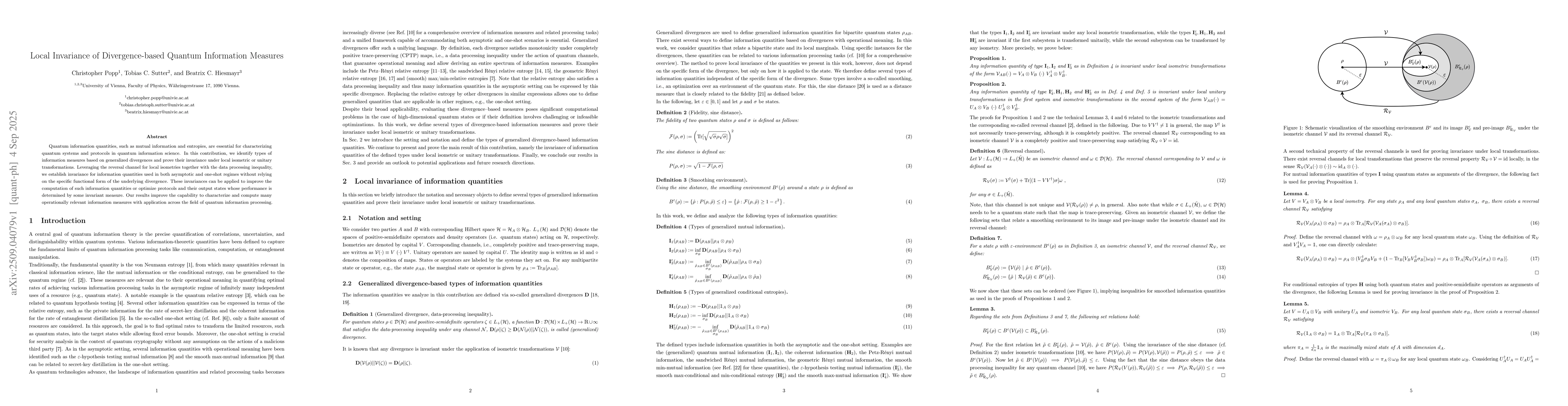 Quantum information quantities, such as mutual information and entropies, are essential for characterizing quantum systems and protocols in quantum information science. In this contribution, we identify types of information measures based on generalized divergences and prove their invariance under local isometric or unitary transformations. Leveraging the reversal channel for local isometries together with the data processing inequality, we establish invariance for information quantities used in both asymptotic and one-shot regimes without relying on the specific functional form of the underlying divergence. These invariances can be applied to improve the computation of such information quantities or optimize protocols and their output states whose performance is determined by some invariant measure. Our results improve the capability to characterize and compute many operationally relevant information measures with application across the field of quantum information processing.