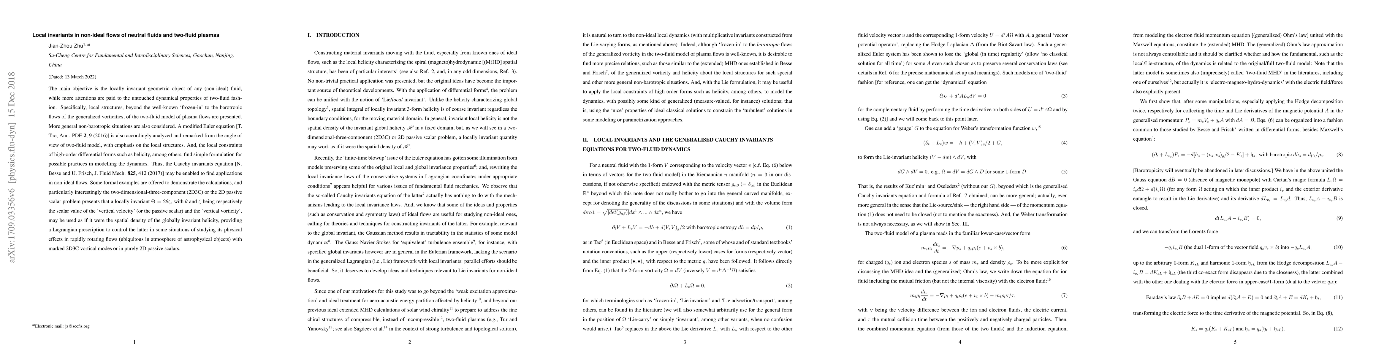 Local structures, beyond the well-known `frozen-in' to the barotropic flows of the generalized vorticities, of the two-fluid model of plasma flows are presented. More general non-barotropic situations are also considered. A modified Euler equation [T. Tao, Ann. PDE \textbf{2}, 9 (2016)] is also accordingly analyzed and remarked from the angle of view of two-fluid model, with emphasis on the local structures. And, the local constraints of high-order differential forms such as helicity, among others, find simple formulation for possible applications in modelling the dynamics. Thus, the Cauchy invariants equation [N. Besse and U. Frisch, J. Fluid Mech. \textbf{825}, 412 (2017)] may find practical application in non-ideal flows. Some formal examples are offered to outline the calculations, and particularly interestingly the two-dimensional-three-component (2D3C) or the 2D passive scalar problem presents that a locally invariant $\Theta = 2\theta \zeta$, with $\theta$ and $\zeta$ being respectively the scalar value of the `vertical velocity' (or the passive scalar) and the `vertical vorticity', may be used as if it were the spatial density of the globally invariant helicity, providing a Lagrangian prescription to control the latter in some situations of studying its physical effects in rapidly rotating flows (ubiquitous in atmosphere of astrophysical objects) with marked 2D3C vortical modes or in purely 2D passive scalars.