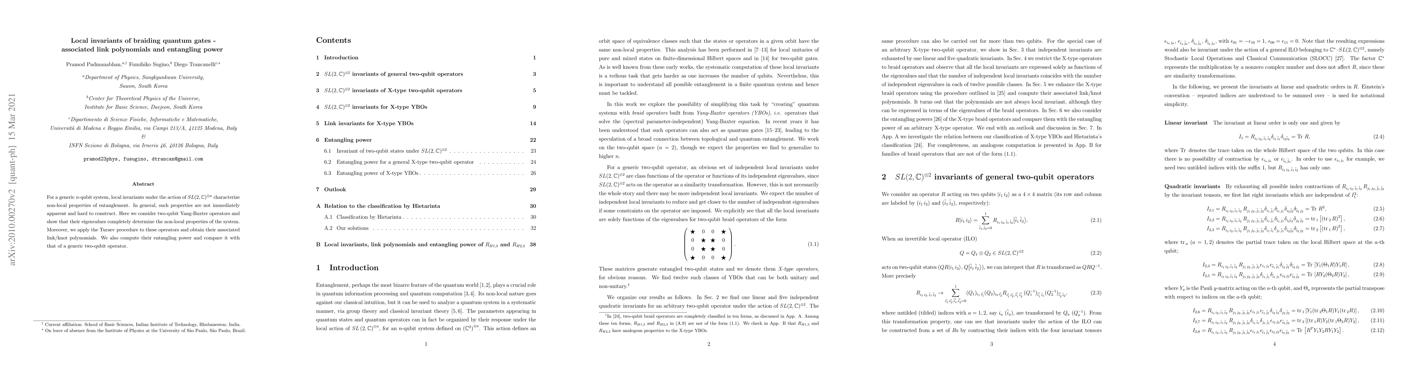 This paper investigates local invariants of braiding quantum gates in $n$-qubit systems, revealing that eigenvalues of specific 'X-type' two-qubit Yang-Baxter operators determine non-local entanglement properties. It uses the Turaev procedure to derive associated link polynomials and computes the entangling power, comparing it with generic two-qubit operators.