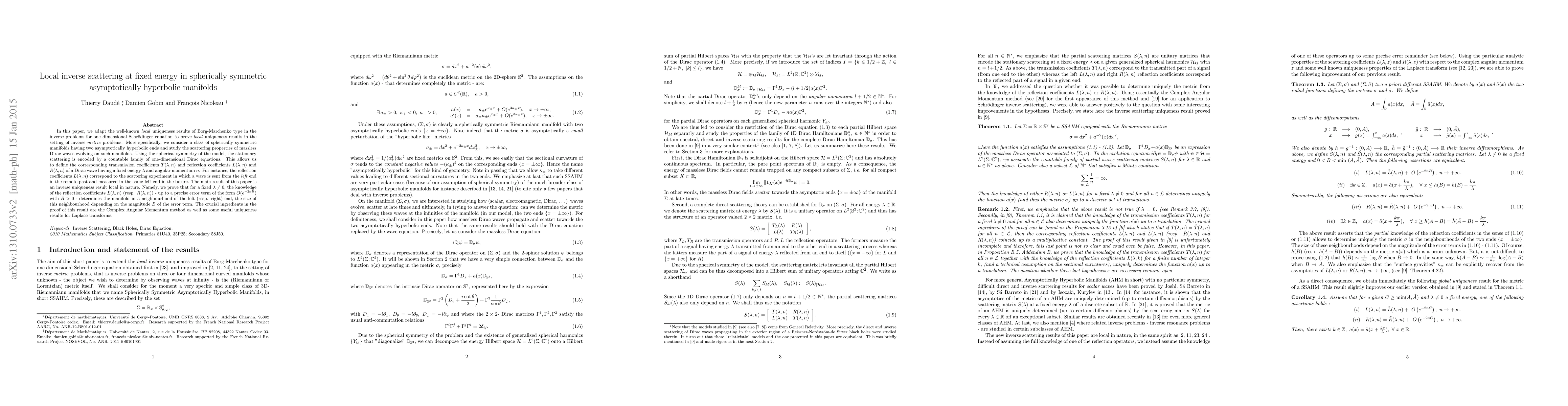 In this paper, we adapt the well-known \emph{local} uniqueness results of Borg-Marchenko type in the inverse problems for one dimensional Schr{\"o}dinger equation to prove \emph{local} uniqueness results in the setting of inverse \emph{metric} problems. More specifically, we consider a class of spherically symmetric manifolds having two asymptotically hyperbolic ends and study the scattering properties of massless Dirac waves evolving on such manifolds. Using the spherical symmetry of the model, the stationary scattering is encoded by a countable family of one-dimensional Dirac equations. This allows us to define the corresponding transmission coefficients $T(\lambda,n)$ and reflection coefficients $L(\lambda,n)$ and $R(\lambda,n)$ of a Dirac wave having a fixed energy $\lambda$ and angular momentum $n$. For instance, the reflection coefficients $L(\lambda,n)$ correspond to the scattering experiment in which a wave is sent from the \emph{left} end in the remote past and measured in the same left end in the future. The main result of this paper is an inverse uniqueness result local in nature. Namely, we prove that for a fixed $\lambda \not=0$, the knowledge of the reflection coefficients $L(\lambda,n)$ (resp. $R(\lambda,n)$) - up to a precise error term of the form $O(e^{-2nB})$ with $B\textgreater{}0$ - determines the manifold in a neighbourhood of the left (resp. right) end, the size of this neighbourhood depending on the magnitude $B$ of the error term. The crucial ingredients in the proof of this result are the Complex Angular Momentum method as well as some useful uniqueness results for Laplace transforms.