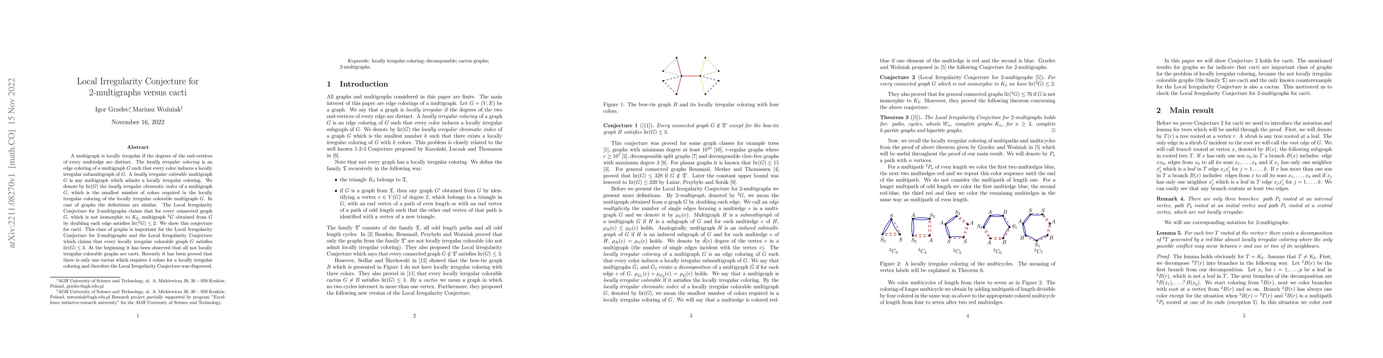 The paper proves the Local Irregularity Conjecture for 2-multigraphs for cacti, showing that the locally irregular chromatic index of a doubled cactus multigraph is at most 2. This supports broader conjectures regarding the locally irregular coloring of graphs and multigraphs.