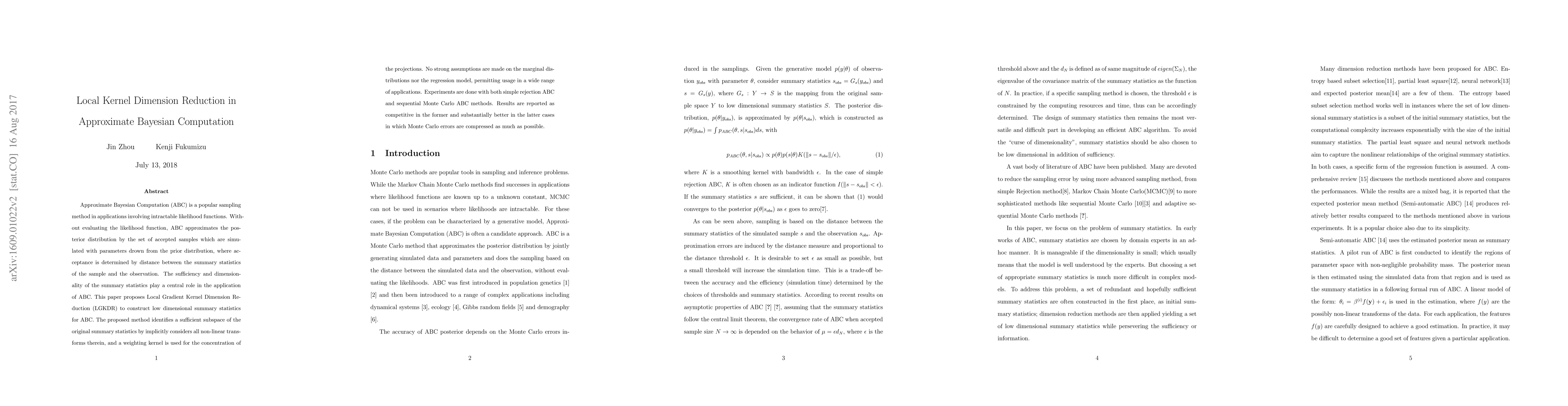 This paper introduces Local Gradient Kernel Dimension Reduction (LGKDR) to enhance Approximate Bayesian Computation (ABC) by constructing low-dimensional summary statistics. The method identifies a sufficient subspace of original summary statistics, effectively reducing dimensionality while maintaining sufficiency and improving concentration of projections.