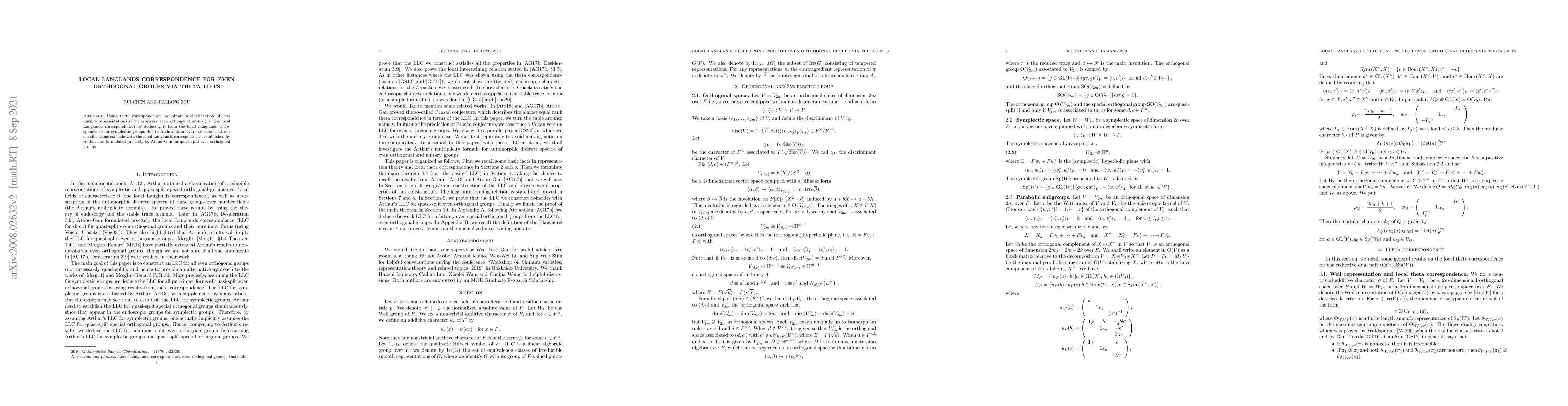 This paper classifies irreducible representations of even orthogonal groups using theta lifts, deriving the local Langlands correspondence from that of symplectic groups via Arthur's work. It confirms the classifications align with Arthur's and Atobe-Gan's established correspondences for quasi-split even orthogonal groups.