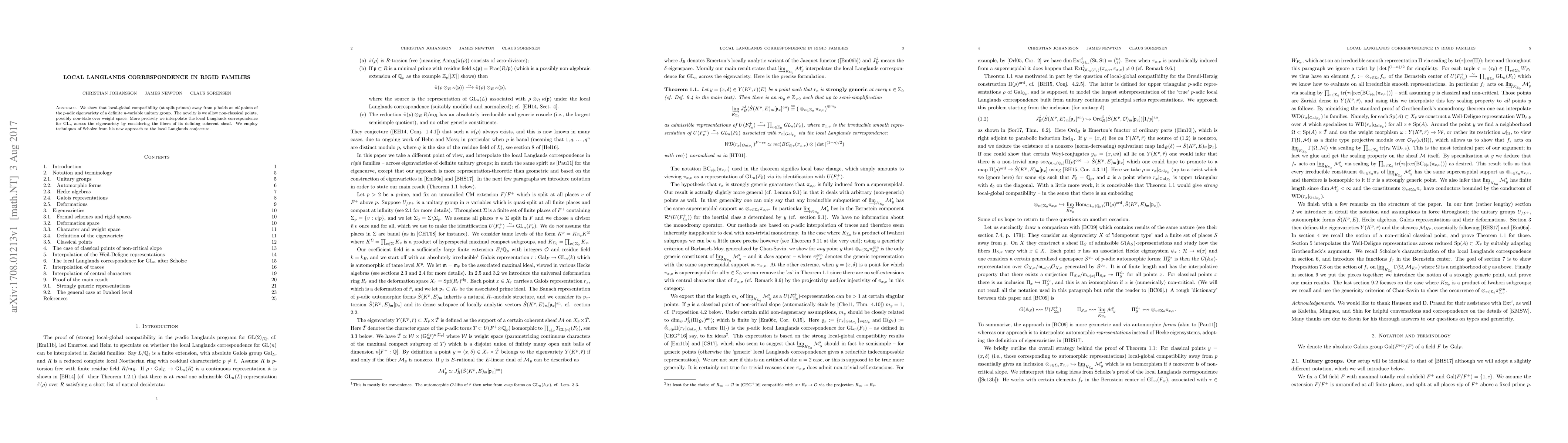 The paper demonstrates local-global compatibility for split primes away from $p$ on the $p$-adic eigenvariety of a definite unitary group, allowing for non-classical points. It utilizes Scholze's techniques to interpolate the local Langlands correspondence for GL(n) via the eigenvariety's coherent sheaf fibers.