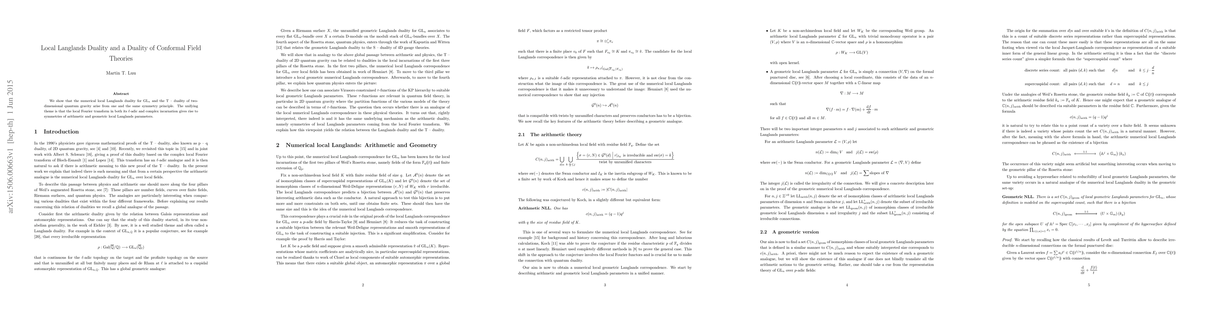 We show that the numerical local Langlands duality for GL_n and the T - duality of two-dimensional quantum gravity arise from one and the same symmetry principle. The unifying theme is that the local Fourier transform in both its l-adic and complex incarnation gives rise to symmetries of arithmetic and geometric local Langlands parameters.