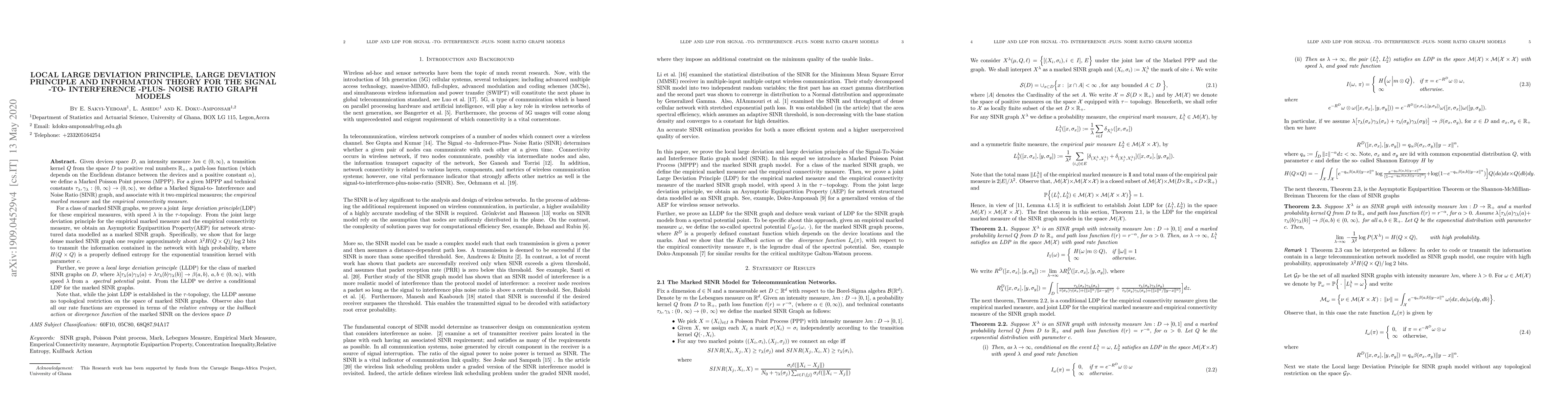 Given devices space $D$, an intensity measure $\lambda m\in(0,\infty)$, a transition kernel $Q$ from the space $D$ to positive real numbers $(0,\infty,$ a path-loss function (which depends on the Euclidean distance between the devices and a positive constant $\alpha$), we define a Marked Poisson Point process (MPPP). For a given MPPP and technical constants $\tau_{\lambda},\gamma_{\lambda}:(0,\,\infty)\to (0,\infty),$ we define a Marked Signal-to- Interference and Noise Ratio (SINR) graph, and associate with it two empirical measures; the \emph{empirical marked measure} and the \emph{empirical connectivity measure}. For a class of marked SINR graphs, we prove a joint \emph{ large deviation principle}(LDP) for these empirical measures, with speed $\lambda$ in the $\tau$-topology. From the joint large deviation principle for the empirical marked measure and the empirical connectivity measure, we obtain an Asymptotic Equipartition Property(AEP) for network structured data modelled as a marked SINR graph. Specifically, we show that for large dense marked SINR graph one require approximately about $\lambda^{2}H(Q\times Q)/\log 2$ bits to transmit the information contained in the network with high probability, where $ H(Q\times Q)$ is a properly defined entropy for the exponential transition kernel with parameter $c$. Further, we prove a \emph {local large deviation principle} (LLDP) for the class of marked SINR graphs on $D,$ where $\lambda[\tau_{\lambda}(a)\gamma_{\lambda}(a)+\lambda\tau_{\lambda}(b)\gamma_{\lambda}(b)]\to \beta(a,b),$ $ a,b\in (0,\infty)$, with speed $\lambda$ from a \emph{ spectral potential} point. From the LLDP we derive a conditional LDP for the marked SINR graphs.