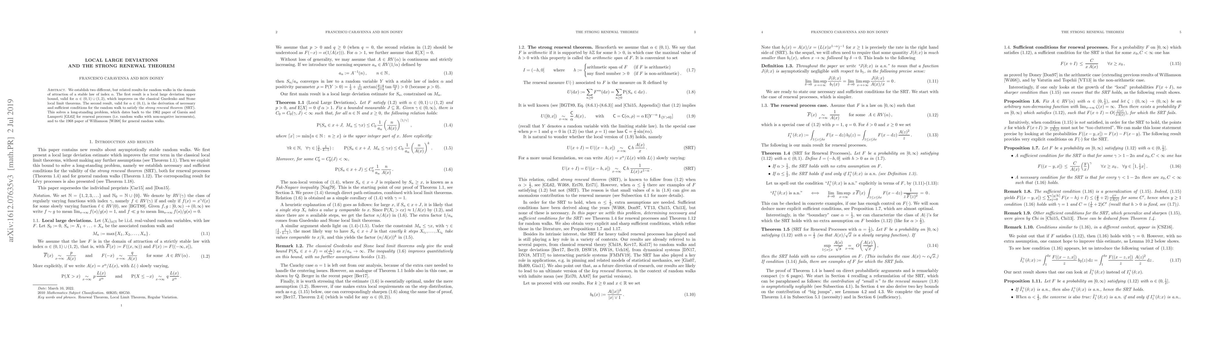 This paper presents improved local large deviation bounds for random walks in the domain of attraction of stable laws and provides necessary and sufficient conditions for these walks to satisfy the strong renewal theorem, solving long-standing problems in the field.