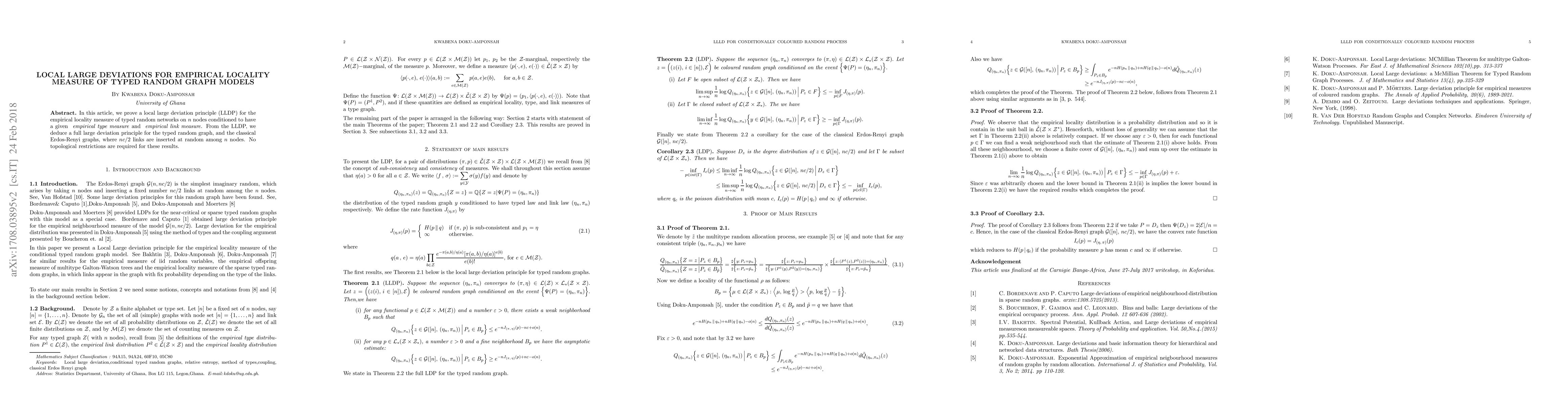 This paper establishes a local large deviation principle for the empirical locality measure in typed random graph models, leading to a full large deviation principle for both typed random graphs and classical Erdos-Renyi graphs, without requiring any topological constraints.