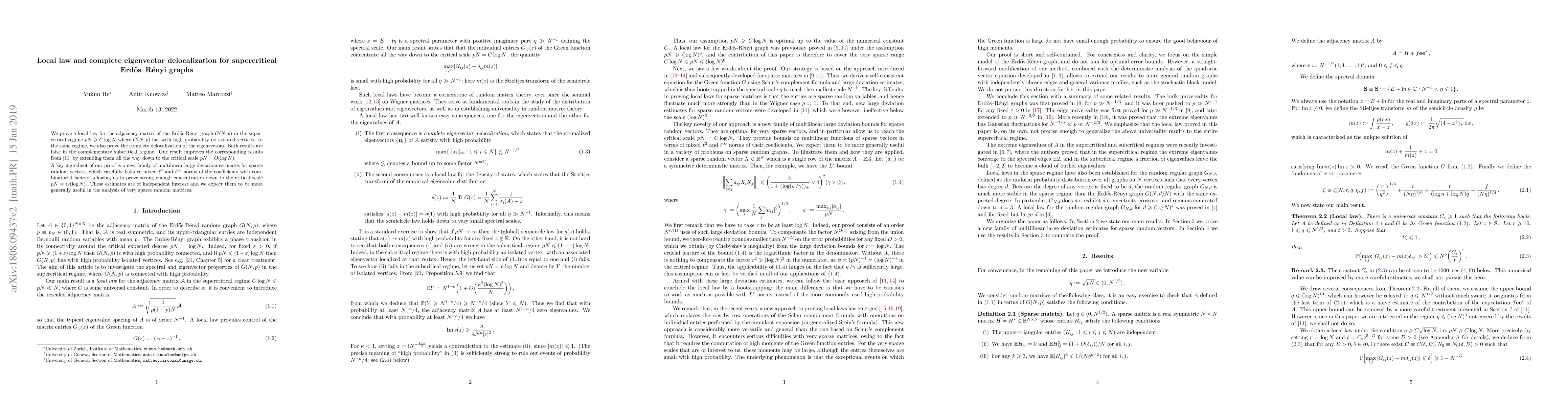 We prove a local law for the adjacency matrix of the Erd\H{o}s-R\'enyi graph $G(N, p)$ in the supercritical regime $ pN \geq C\log N$ where $G(N,p)$ has with high probability no isolated vertices. In the same regime, we also prove the complete delocalization of the eigenvectors. Both results are false in the complementary subcritical regime. Our result improves the corresponding results from [11] by extending them all the way down to the critical scale $pN = O(\log N)$. A key ingredient of our proof is a new family of multilinear large deviation estimates for sparse random vectors, which carefully balance mixed $\ell^2$ and $\ell^\infty$ norms of the coefficients with combinatorial factors, allowing us to prove strong enough concentration down to the critical scale $pN = O(\log N)$. These estimates are of independent interest and we expect them to be more generally useful in the analysis of very sparse random matrices.