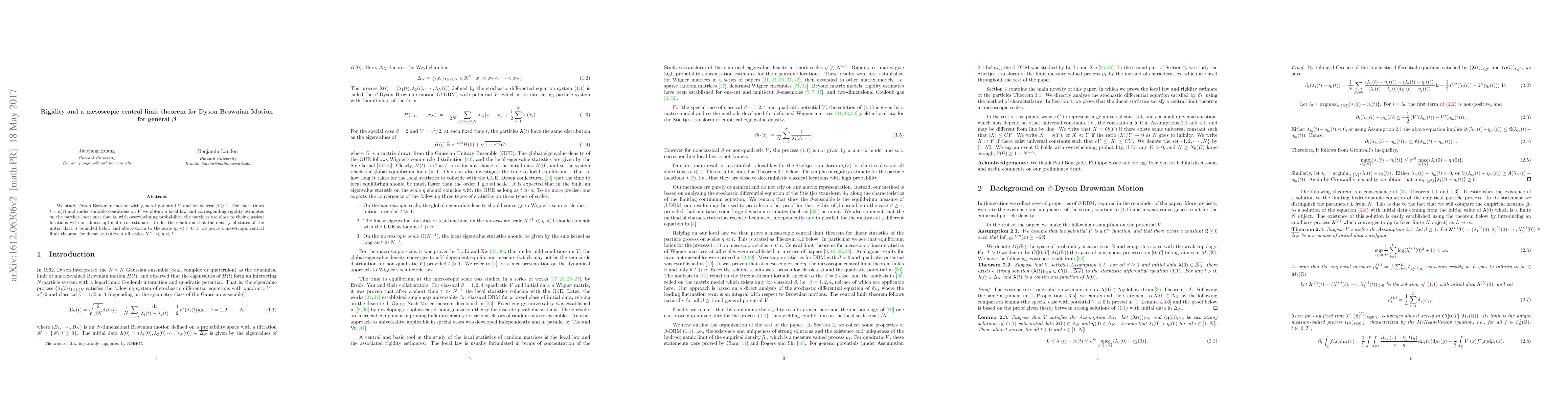 This paper studies Dyson Brownian motion with a general potential and temperature, showing that particles tend to stay near their classical locations for short times, and proves a mesoscopic central limit theorem at smaller scales.