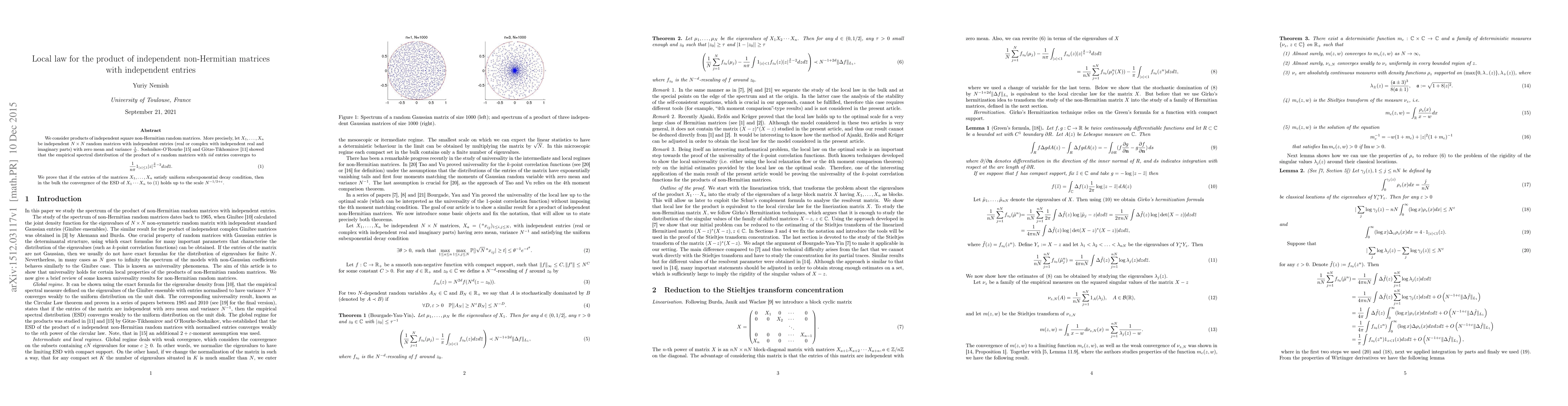 Summary: This paper investigates the convergence of the empirical spectral distribution (ESD) of products of independent non-Hermitian random matrices. It proves that under uniform subexponential decay conditions, the ESD of the product converges optimally in the bulk to the n-th power of the circular law.