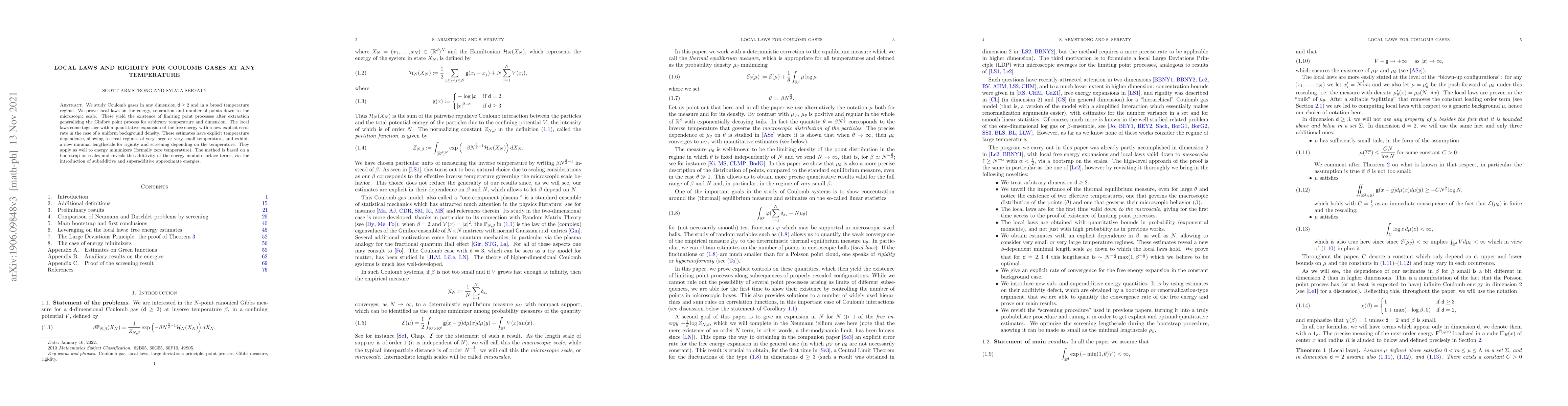 This paper proves local laws for Coulomb gases in any dimension and temperature, establishing limiting point processes and a quantitative expansion of free energy with explicit temperature dependence. The method reveals additivity of energy and introduces new minimal lengthscales for rigidity, applicable to both finite and zero temperature regimes.