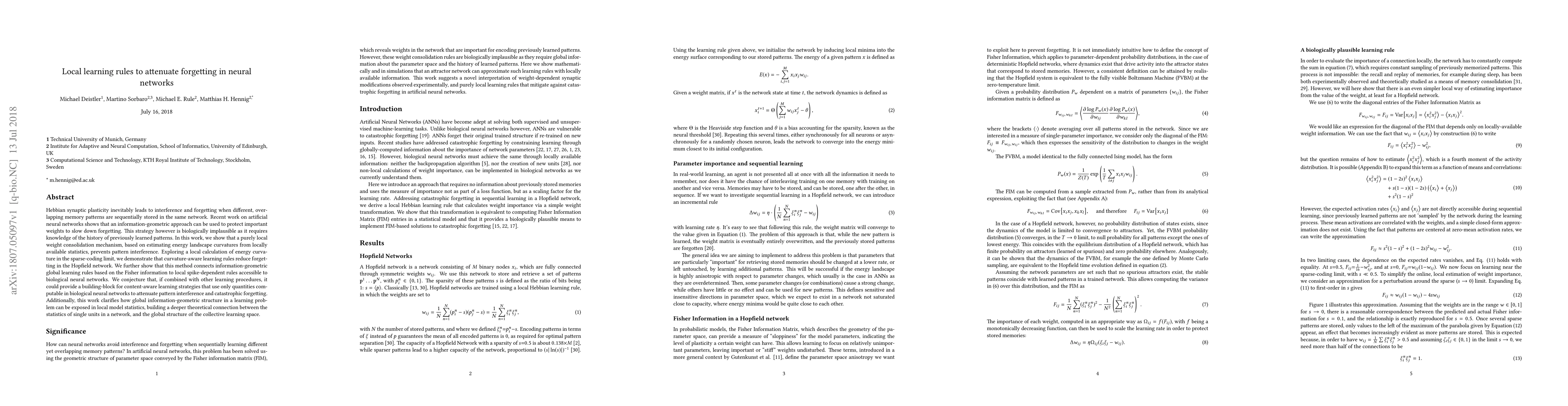This paper proposes a local learning rule based on energy landscape curvature estimates to mitigate forgetting in neural networks, demonstrating its effectiveness in Hopfield networks. It connects global information-geometric learning rules to local, biologically plausible spike-dependent rules, suggesting a potential foundation for content-aware learning strategies.