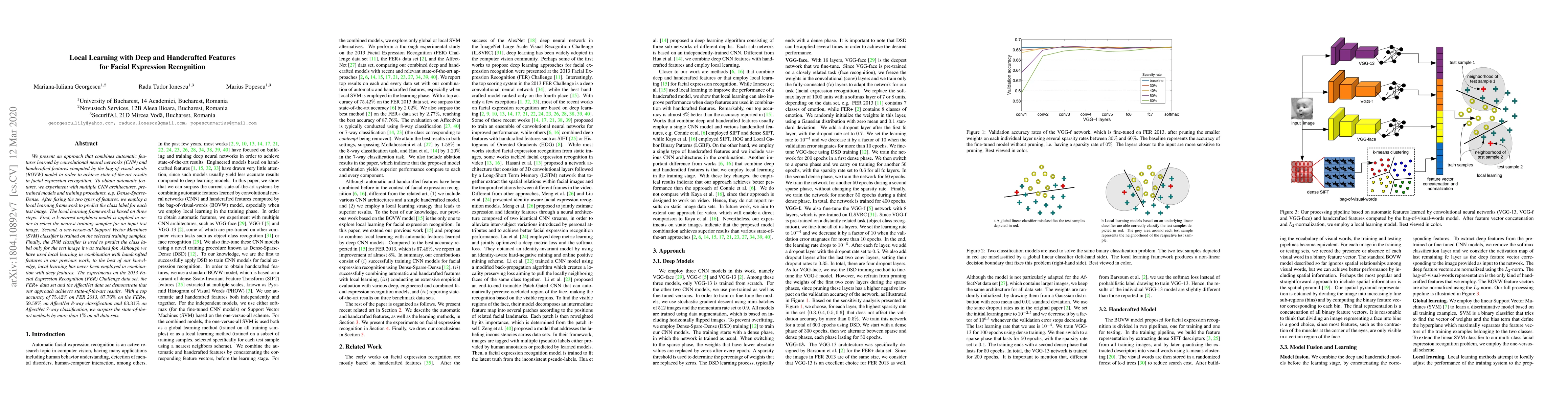 This paper combines convolutional neural networks (CNN) and handcrafted bag-of-visual-words (BOVW) features for facial expression recognition, achieving state-of-the-art results. It employs a local learning framework with k-nearest neighbors and one-versus-all SVM classifiers, demonstrating superior accuracy on multiple datasets.