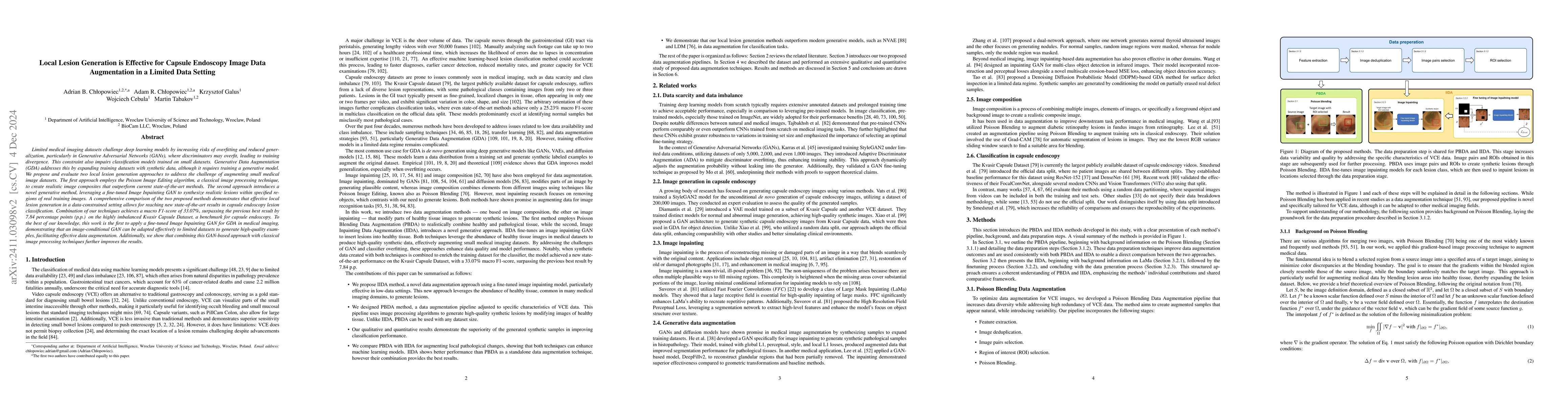 This research proposes two innovative local lesion generation methods to augment small medical imaging datasets for capsule endoscopy, improving classification accuracy. The first uses the Poisson Image Editing algorithm, while the second employs a fine-tuned Image Inpainting GAN. Combining these techniques achieves a macro F1-score of 33.07%, significantly outperforming previous results on the Kvasir Capsule Dataset.