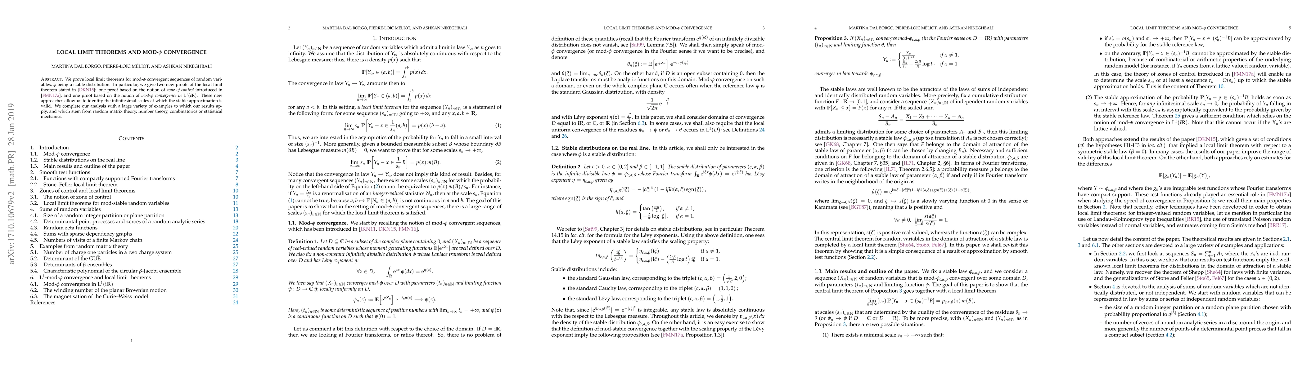 The paper employs techniques from probability theory, specifically focusing on local limit theorems and mod-phi convergence for sequences of random variables, with applications in random matrix theory, number theory, combinatorics, and statistical mechanics.