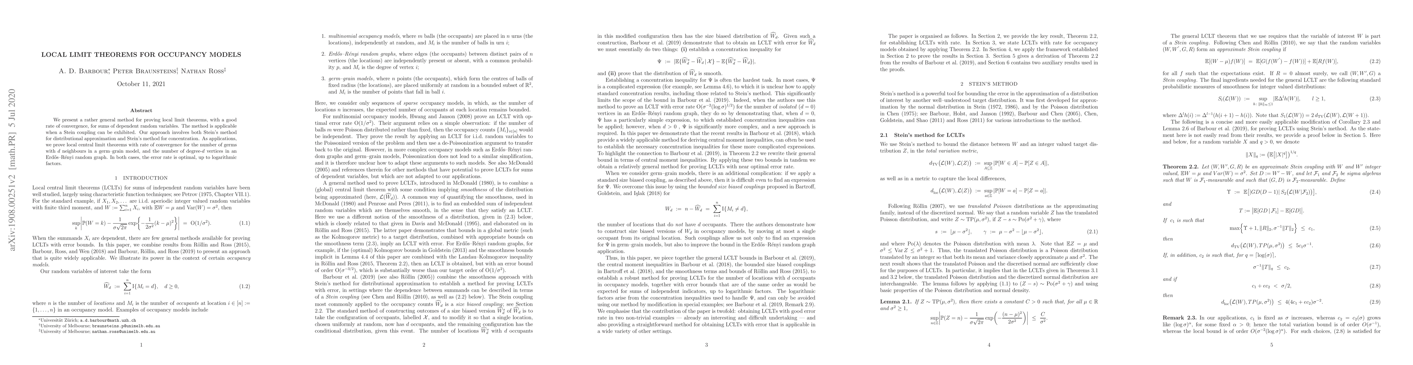 This paper develops a general method for proving local limit theorems for sums of dependent random variables using Stein coupling, combining both distributional and concentration versions of Stein's method. It applies this method to occupancy models, achieving optimal error rates for the number of germs with $d$ neighbors and degree-$d$ vertices in random graphs.