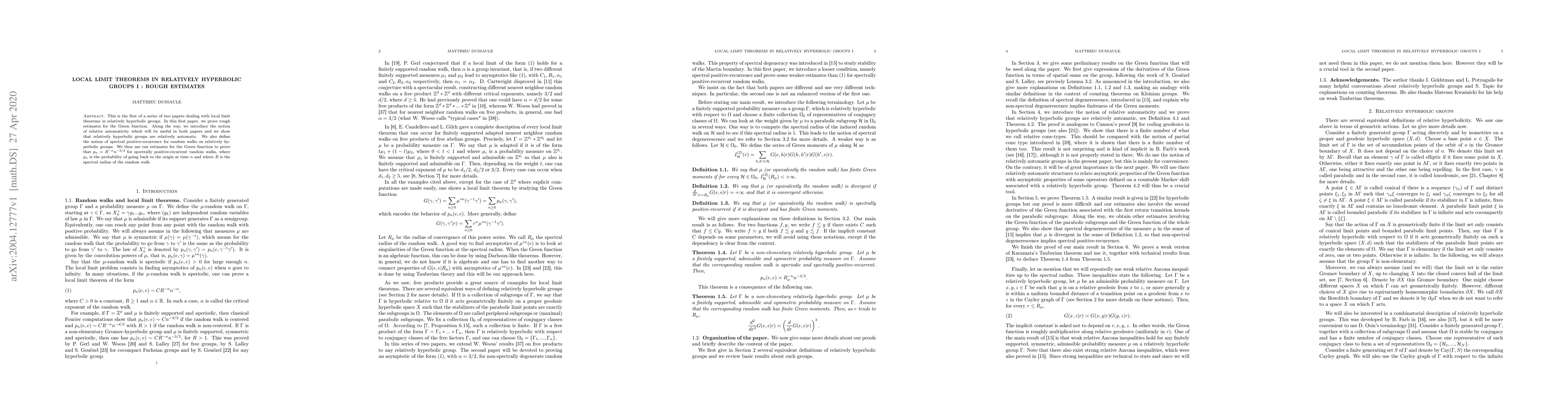 This is the first of a series of two papers dealing with local limit theorems in relatively hyperbolic groups. In this first paper, we prove rough estimates for the Green function. Along the way, we introduce the notion of relative automaticity which will be useful in both papers and we show that relatively hyperbolic groups are relatively automatic. We also define the notion of spectral positive-recurrence for random walks on relatively hy-perbolic groups. We then use our estimates for the Green function to prove that $p_n \asymp R^n n^{-3/2}$ for spectrally positive-recurrent random walks, where $p_n$ is the probability of going back to the origin at time n and where R is the spectral radius of the random walk.