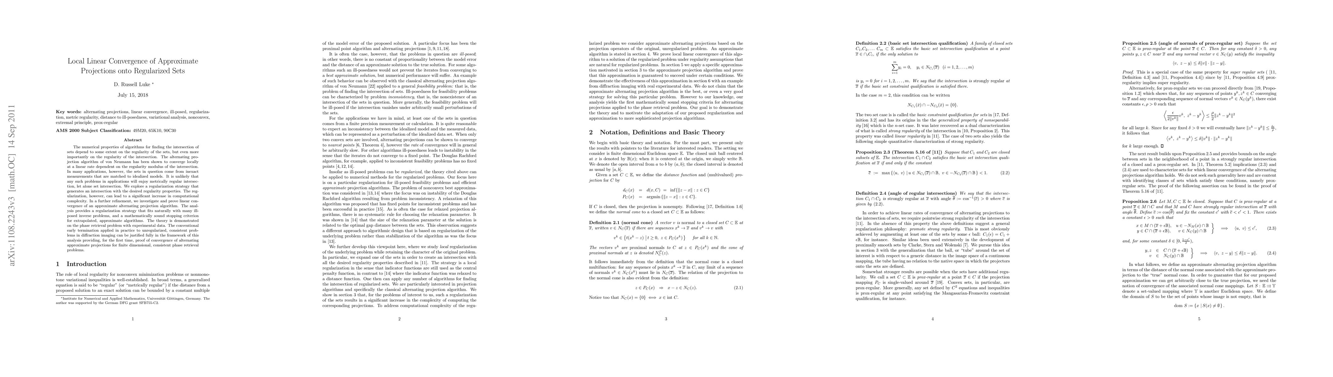 The numerical properties of algorithms for finding the intersection of sets depend to some extent on the regularity of the sets, but even more importantly on the regularity of the intersection. The alternating projection algorithm of von Neumann has been shown to converge locally at a linear rate dependent on the regularity modulus of the intersection. In many applications, however, the sets in question come from inexact measurements that are matched to idealized models. It is unlikely that any such problems in applications will enjoy metrically regular intersection, let alone set intersection. We explore a regularization strategy that generates an intersection with the desired regularity properties. The regularization, however, can lead to a significant increase in computational complexity. In a further refinement, we investigate and prove linear convergence of an approximate alternating projection algorithm. The analysis provides a regularization strategy that fits naturally with many ill-posed inverse problems, and a mathematically sound stopping criterion for extrapolated, approximate algorithms. The theory is demonstrated on the phase retrieval problem with experimental data. The conventional early termination applied in practice to unregularized, consistent problems in diffraction imaging can be justified fully in the framework of this analysis providing, for the first time, proof of convergence of alternating approximate projections for finite dimensional, consistent phase retrieval problems.