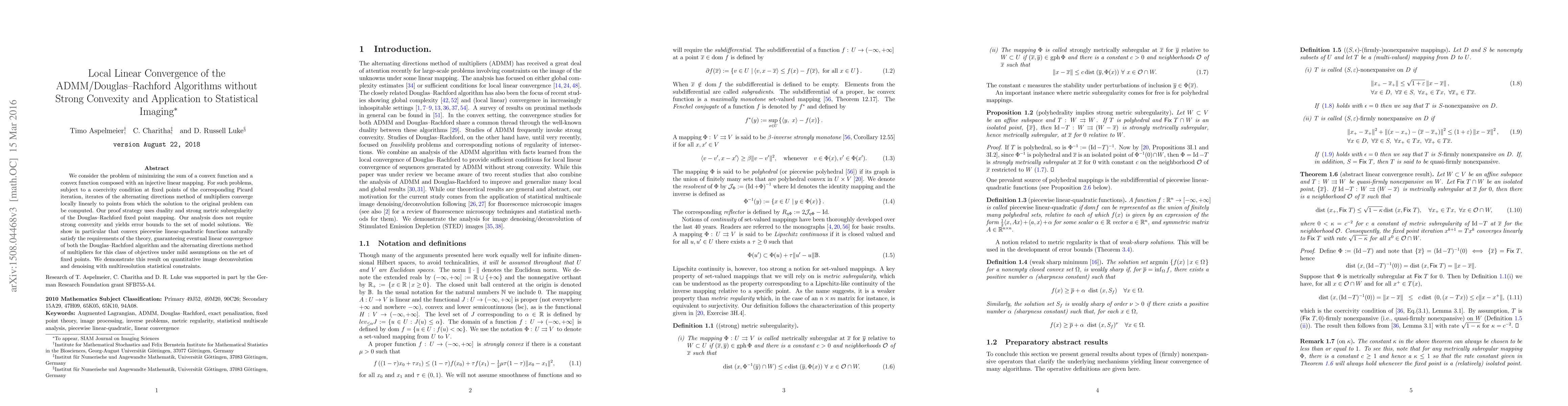 This paper proves local linear convergence of the ADMM and Douglas-Rachford algorithms for minimizing the sum of convex functions without requiring strong convexity. The analysis applies to statistical imaging tasks, demonstrating eventual linear convergence for convex piecewise linear-quadratic functions in image deconvolution and denoising.